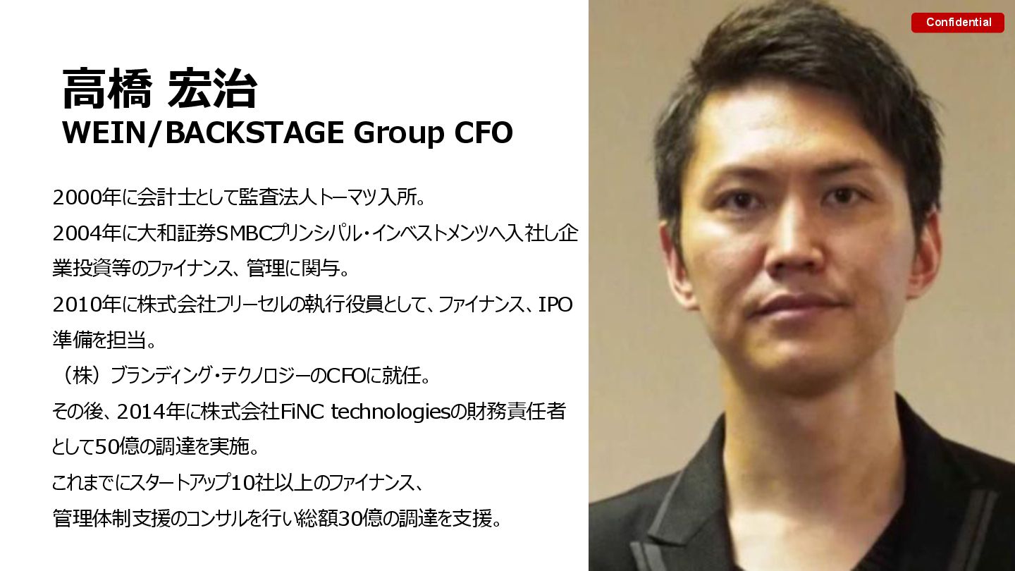 22. 高橋 宏治 WEIN/BACKSTAGE Group CFO 2000年に会計士として監査法人トーマツ入所。 2004年に大和証券SMBCプリンシパル・インベストメンツへ入社し企 業投資等のファイナンス、管理に関与。 2010年に株式会社フリーセルの執行役員として、ファイナンス、IPO 準備を担当。