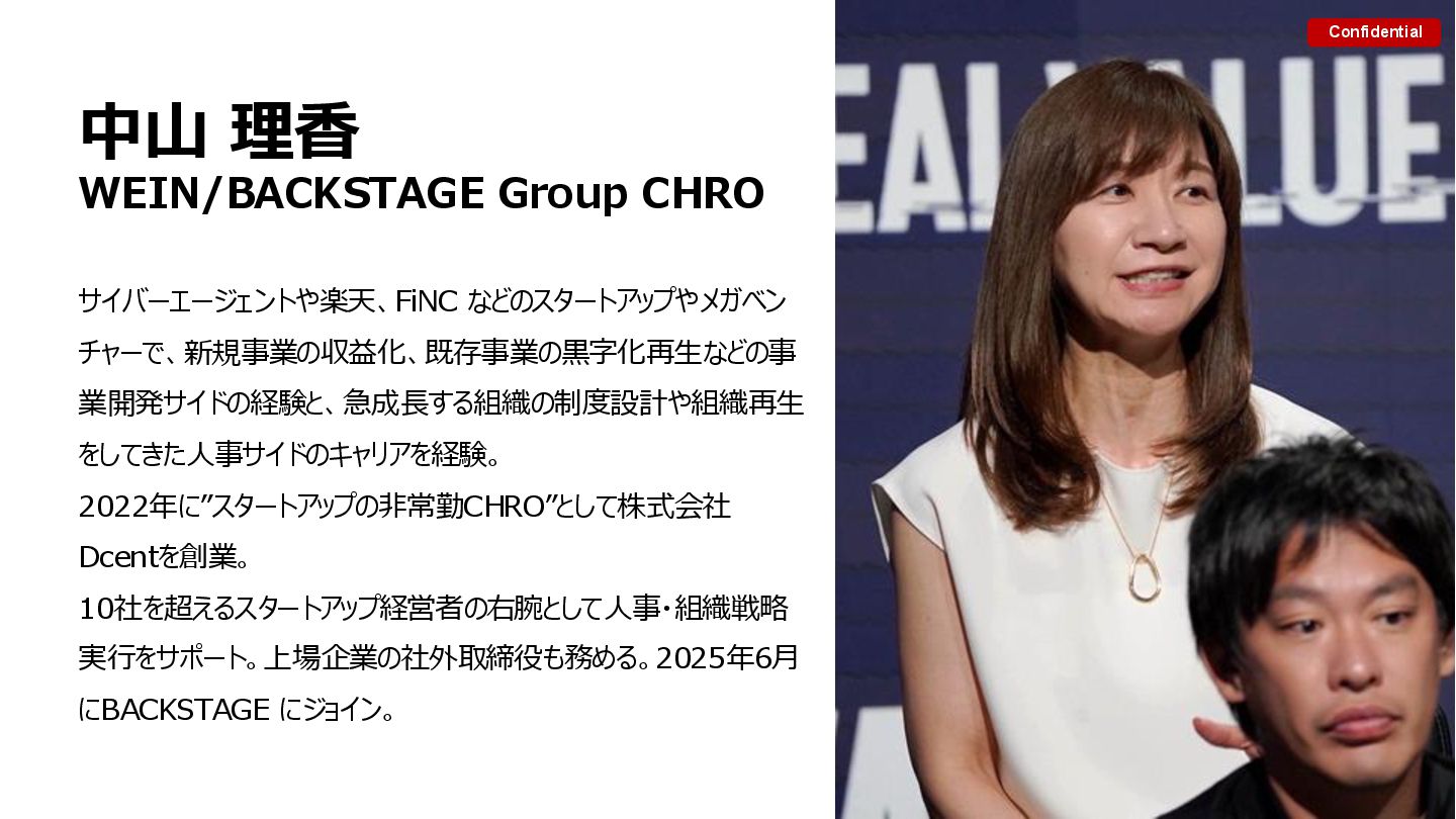23. 中山 理香 WEIN/BACKSTAGE Group CHRO サイバーエージェントや楽天、FiNC などのスタートアップやメガベン チャーで、新規事業の収益化、既存事業の黒字化再生などの事 業開発サイドの経験と、急成長する組織の制度設計や組織再生 をしてきた人事サイドのキャリアを経験。