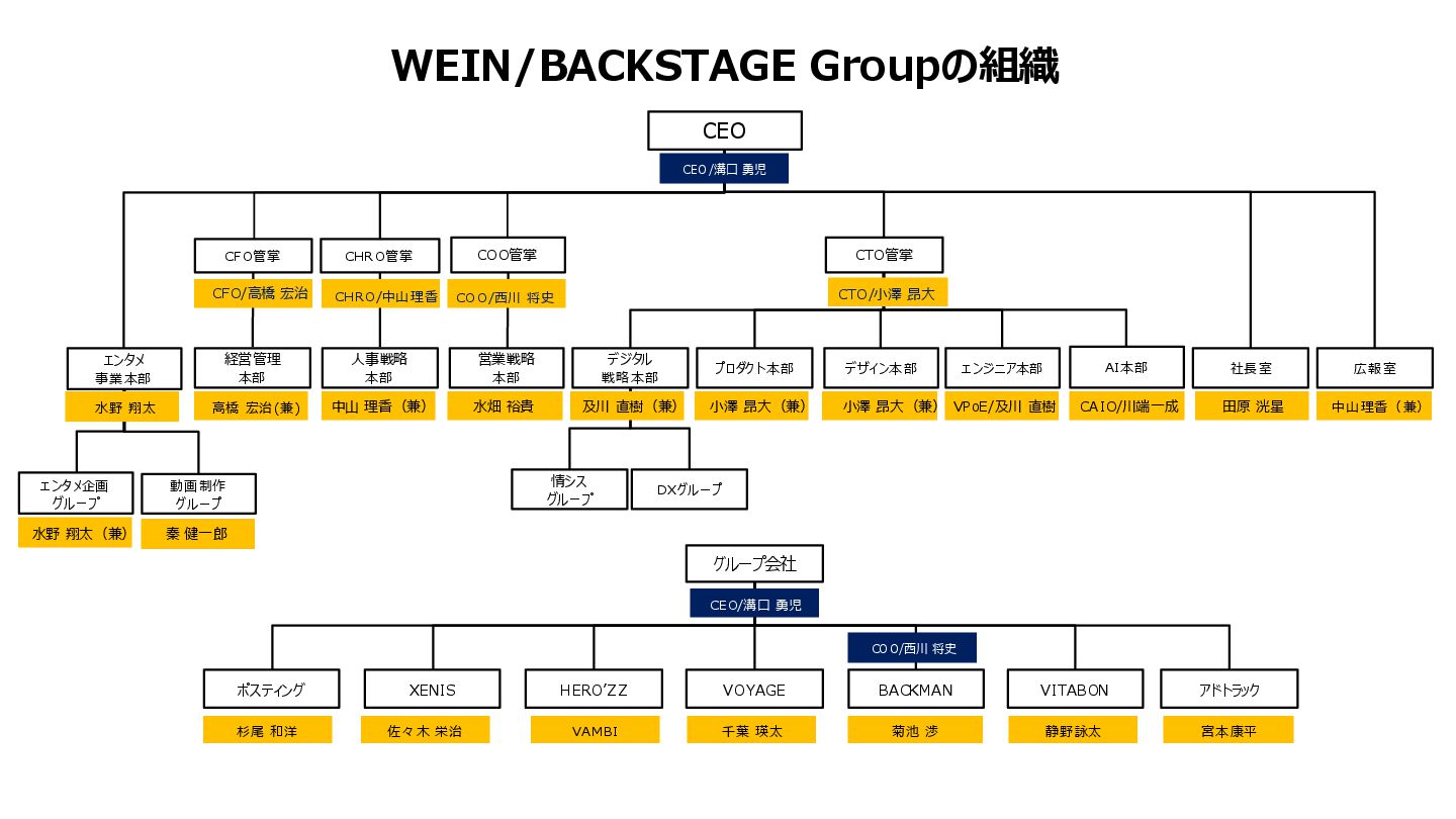 経営管理 本部 動画制作 グループ 広報室 デジタル 戦略本部 エンタメ 事業本部 CHRO管掌 COO管掌 水畑 裕貴 ポスティング XENIS HERO’ZZ VOYAGE BACKMAN グループ会社 杉尾 和洋 佐々木 栄治 VAMBI 千葉 瑛太 デザイン本部 プロダクト本部 エンジニア本部 CTO/小澤 昂大 情シス グループ DXグループ 中山 理香(兼) 田原 洸星 高橋 宏治(兼) 小澤 昂大(兼) 及川 直樹(兼) CAIO/川端一成 秦 健一郎 COO/西川 将史 CFO/高橋 宏治 CHRO/中山理香 COO/西川 将史 VITABON アドトラック 静野詠太 宮本康平 CEO/溝口 勇児 菊池 渉 中山理香(兼) WEIN/BACKSTAGE Groupの組織 CEO/溝口 勇児 水野 翔太 小澤 昂大(兼) AI本部 VPoE/及川 直樹 水野 翔太(兼)