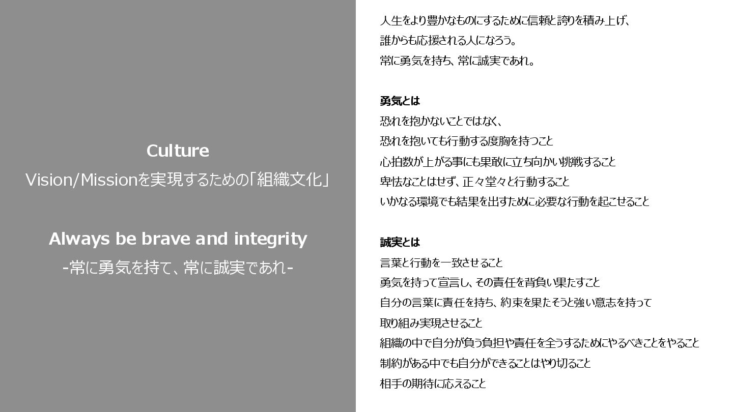 常に勇気を持ち、常に誠実であれ。 勇気とは 恐れを抱かないことではなく、 恐れを抱いても行動する度胸を持つこと 心拍数が上がる事にも果敢に立ち向かい挑戦すること 卑怯なことはせず、正々堂々と行動すること いかなる環境でも結果を出すために必要な行動を起こせること 誠実とは 言葉と行動を一致させること 勇気を持って宣言し、その責任を背負い果たすこと 自分の言葉に責任を持ち、約束を果たそうと強い意志を持って 取り組み実現させること 組織の中で自分が負う負担や責任を全うするためにやるべきことをやること 制約がある中でも自分ができることはやり切ること 相手の期待に応えること