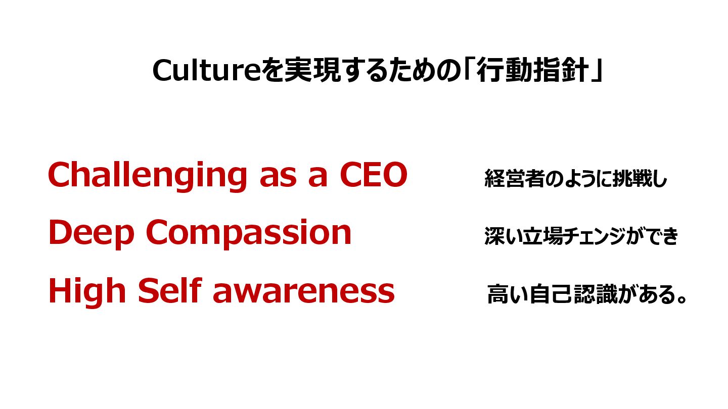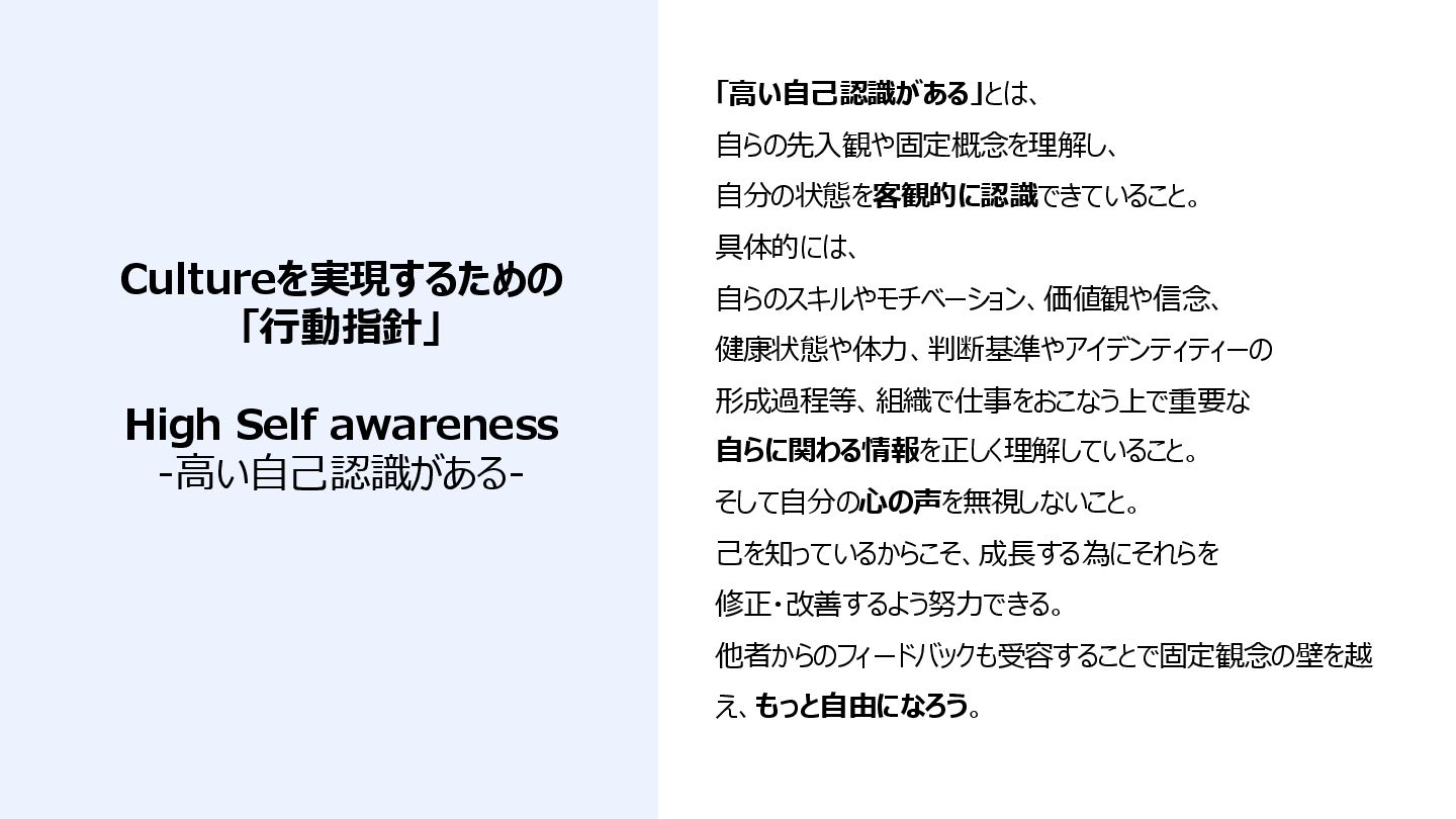 awareness 高い自己認識がある。 Cultureを実現するための「行動指針」