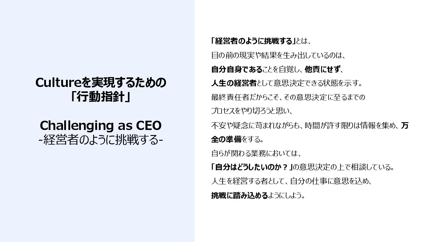 27. Cultureを実現するための 「行動指針」 Challenging as CEO -経営者のように挑戦する- 「経営者のように挑戦する」とは、 目の前の現実や結果を生み出しているのは、 自分自身であることを自覚し、他責にせず、 人生の経営者として意思決定できる状態を示す。
