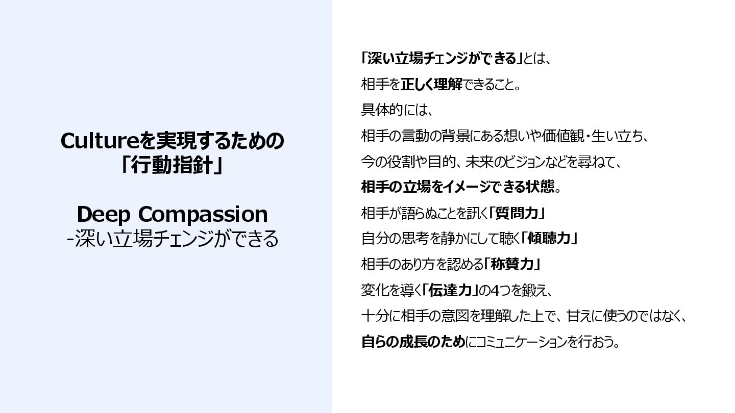 28. Cultureを実現するための 「行動指針」 Deep Compassion -深い立場チェンジができる 「深い立場チェンジができる」とは、 相手を正しく理解できること。 具体的には、 相手の言動の背景にある想いや価値観・生い立ち、 今の役割や目的、未来のビジョンなどを尋ねて、