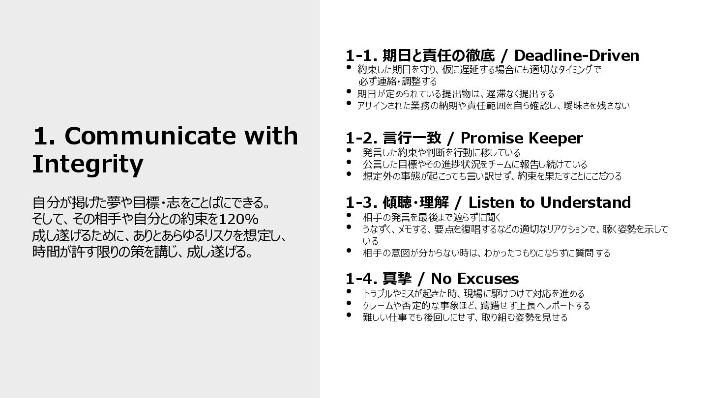 / Deadline-Driven • 約束した期日を守り、仮に遅延する場合にも適切なタイミングで 必ず連絡・調整する • 期日が定められている提出物は、遅滞なく提出する • アサインされた業務の納期や責任範囲を自ら確認し、曖昧さを残さない 1-2. 言行一致 / Promise Keeper • 発言した約束や判断を行動に移している • 公言した目標やその進捗状況をチームに報告し続けている • 想定外の事態が起こっても言い訳せず、約束を果たすことにこだわる 1-3. 傾聴・理解 / Listen to Understand • 相手の発言を最後まで遮らずに聞く • うなずく、メモする、要点を復唱するなどの適切なリアクションで、聴く姿勢を示して いる • 相手の意図が分からない時は、わかったつもりにならずに質問する 1-4. 真摯 / No Excuses • トラブルやミスが起きた時、現場に駆けつけて対応を進める • クレームや否定的な事象ほど、躊躇せず上長へレポートする • 難しい仕事でも後回しにせず、取り組む姿勢を見せる