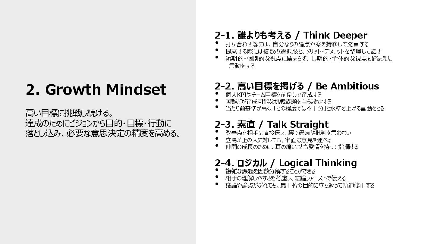 Deeper • 打ち合わせ等には、自分なりの論点や案を持参して発言する • 提案する際には複数の選択肢と、メリット・デメリットを整理して話す • 短期的・個別的な視点に留まらず、長期的・全体的な視点も踏まえた 言動をする 2-2. 高い目標を掲げる / Be Ambitious • 個人KPIやチーム目標を前倒しで達成する • 困難だが達成可能な挑戦課題を自ら設定する • 当たり前基準が高く、「この程度では不十分」と水準を上げる言動をとる 2-3. 素直 / Talk Straight • 改善点を相手に直接伝え、裏で愚痴や批判を言わない • 立場が上の人に対しても、率直な意見を述べる • 仲間の成長のために、耳の痛いことも愛情を持って指摘する 2-4. ロジカル / Logical Thinking • 複雑な課題を因数分解することができる • 相手の理解しやすさを考慮し、結論ファーストで伝える • 議論や論点がぶれても、最上位の目的に立ち返って軌道修正する