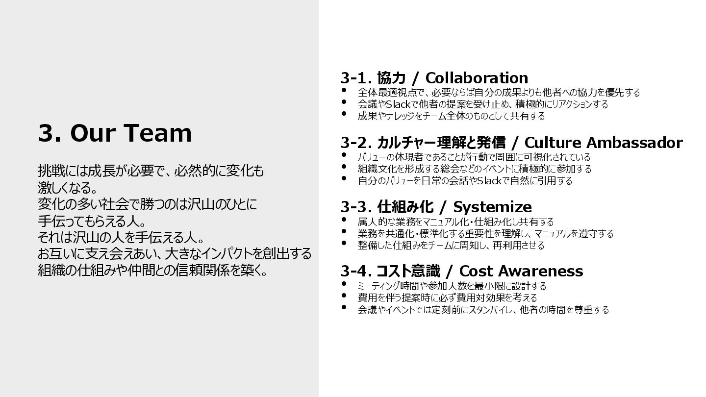 3-1. 協力 / Collaboration • 全体最適視点で、必要ならば自分の成果よりも他者への協力を優先する • 会議やSlackで他者の提案を受け止め、積極的にリアクションする • 成果やナレッジをチーム全体のものとして共有する 3-2. カルチャー理解と発信 / Culture Ambassador • バリューの体現者であることが行動で周囲に可視化されている • 組織文化を形成する総会などのイベントに積極的に参加する • 自分のバリューを日常の会話やSlackで自然に引用する 3-3. 仕組み化 / Systemize • 属人的な業務をマニュアル化・仕組み化し共有する • 業務を共通化・標準化する重要性を理解し、マニュアルを遵守する • 整備した仕組みをチームに周知し、再利用させる 3-4. コスト意識 / Cost Awareness • ミーティング時間や参加人数を最小限に設計する • 費用を伴う提案時に必ず費用対効果を考える • 会議やイベントでは定刻前にスタンバイし、他者の時間を尊重する