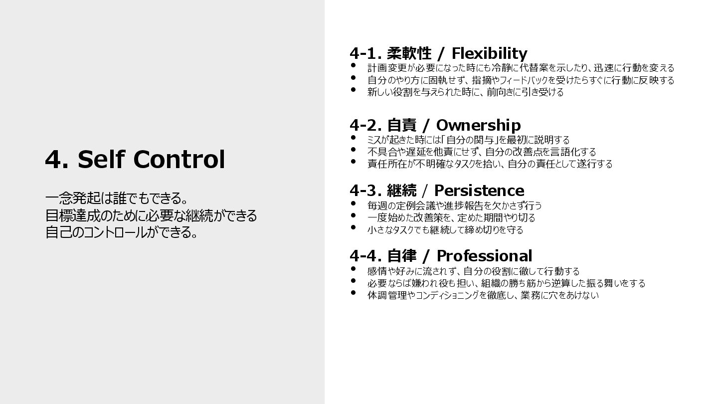 • 計画変更が必要になった時にも冷静に代替案を示したり、迅速に行動を変える • 自分のやり方に固執せず、指摘やフィードバックを受けたらすぐに行動に反映する • 新しい役割を与えられた時に、前向きに引き受ける 4-2. 自責 / Ownership • ミスが起きた時には「自分の関与」を最初に説明する • 不具合や遅延を他責にせず、自分の改善点を言語化する • 責任所在が不明確なタスクを拾い、自分の責任として遂行する 4-3. 継続 / Persistence • 毎週の定例会議や進捗報告を欠かさず行う • 一度始めた改善策を、定めた期間やり切る • 小さなタスクでも継続して締め切りを守る 4-4. 自律 / Professional • 感情や好みに流されず、自分の役割に徹して行動する • 必要ならば嫌われ役も担い、組織の勝ち筋から逆算した振る舞いをする • 体調管理やコンディショニングを徹底し、業務に穴をあけない