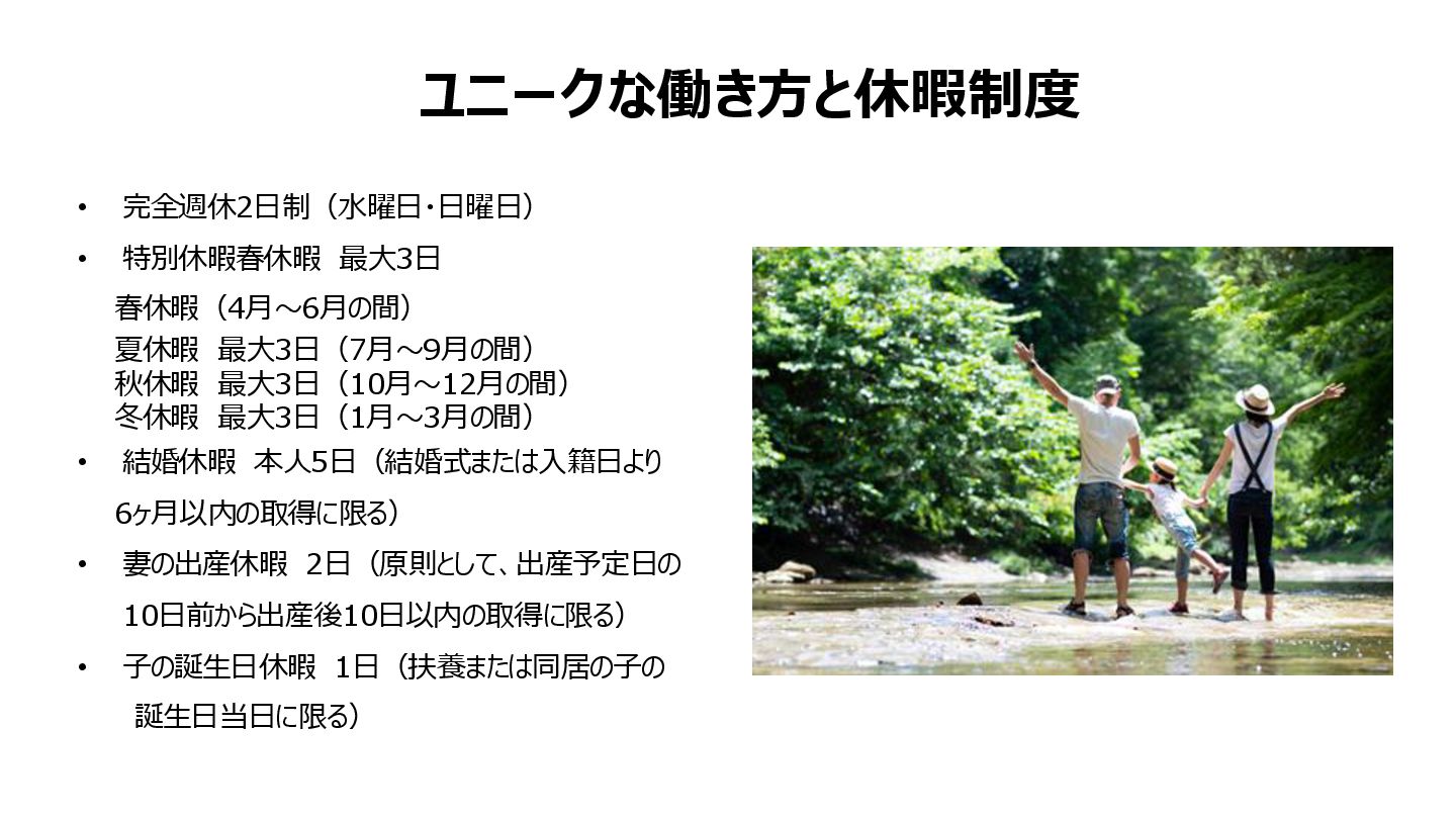 最大3日(10月〜12月の間) 冬休暇 最大3日(1月〜3月の間) • 結婚休暇 本人5日(結婚式または入籍日より 6ヶ月以内の取得に限る) • 妻の出産休暇 2日(原則として、出産予定日の 10日前から出産後10日以内の取得に限る) • 子の誕生日休暇 1日(扶養または同居の子の 誕生日当日に限る)