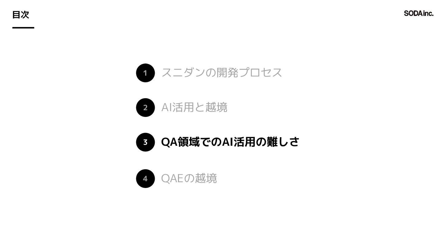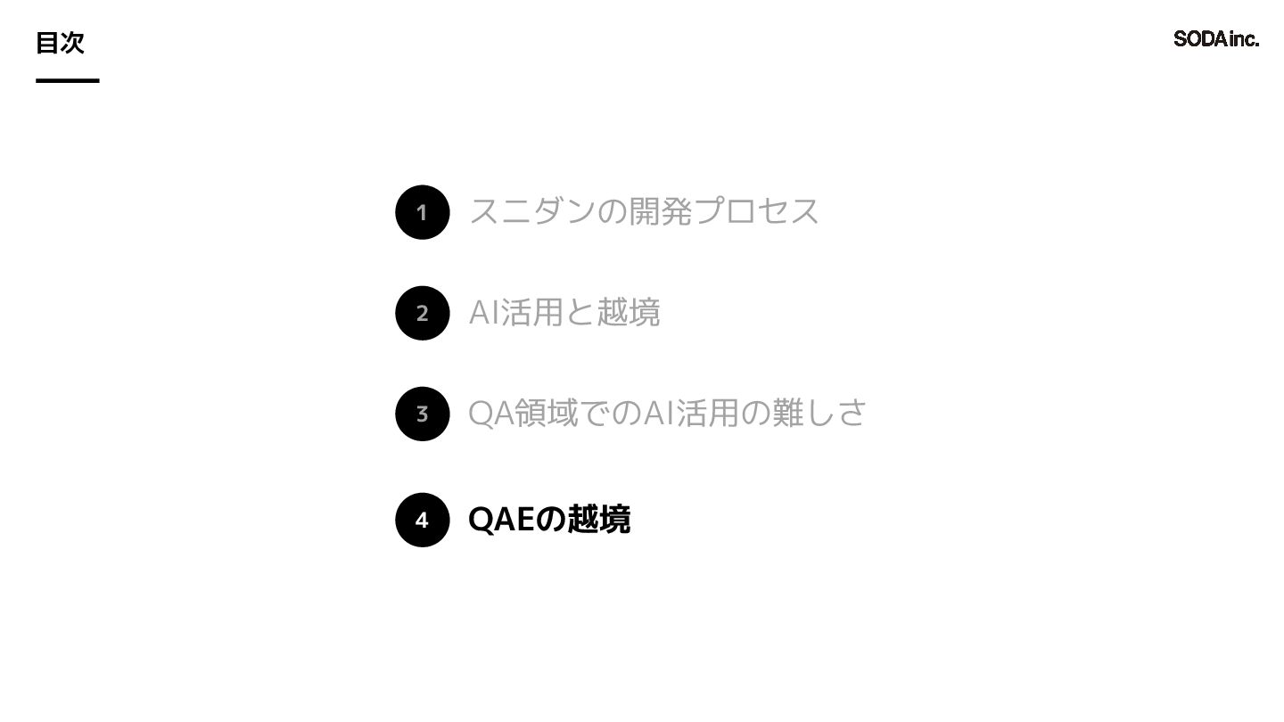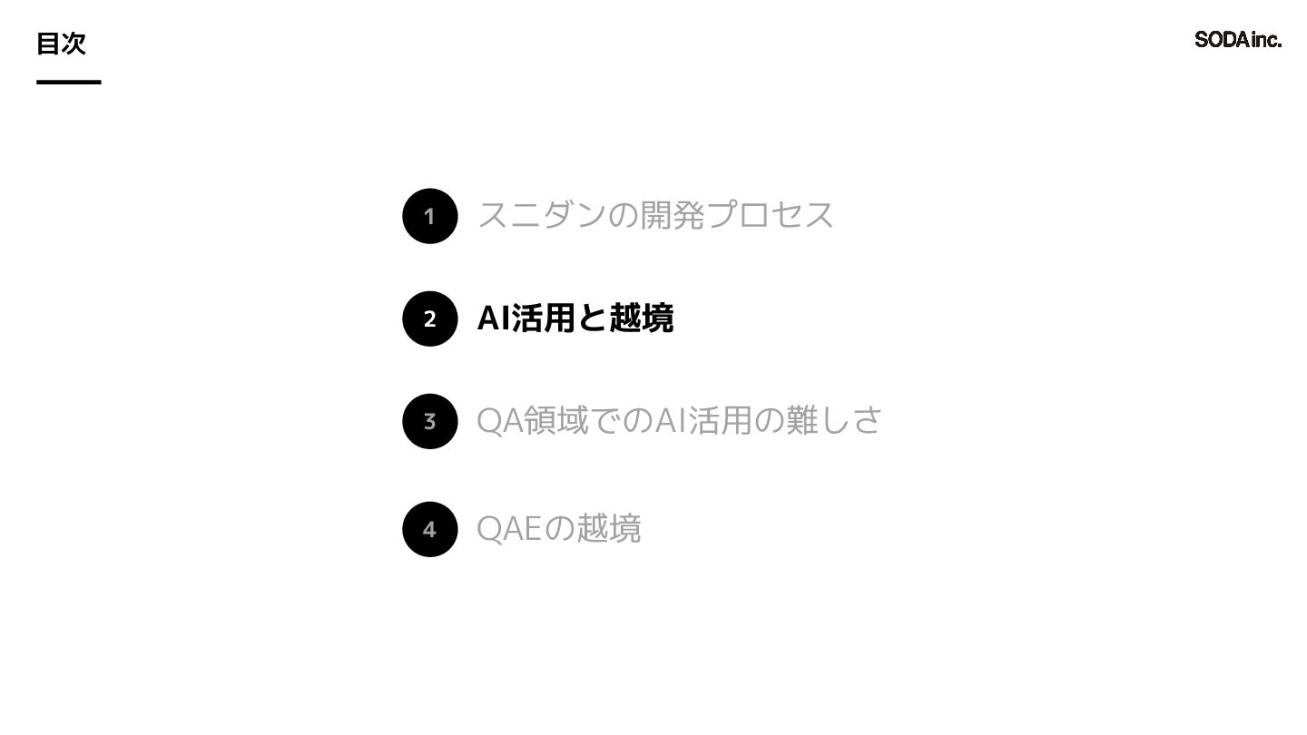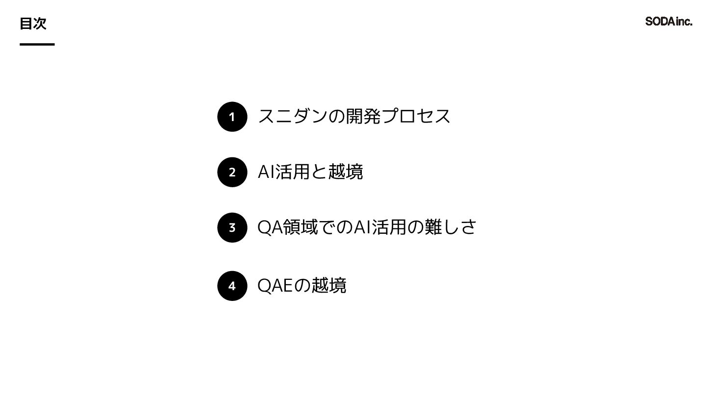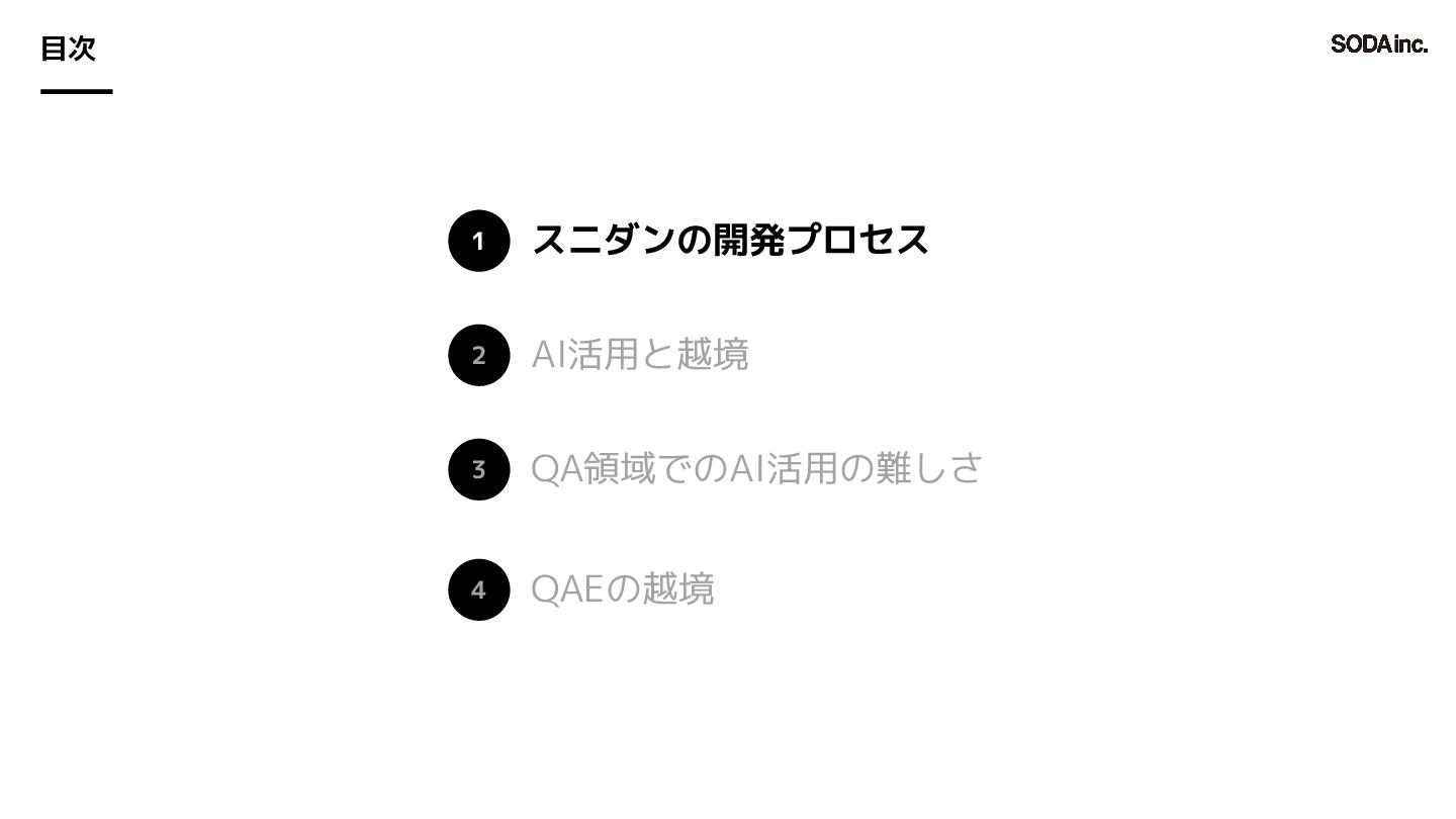目次 スニダンの開発プロセス 1 AI活用と越境 2 QA領域でのAI活用の難しさ 3 QAEの越境 4