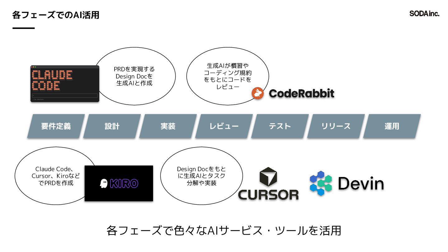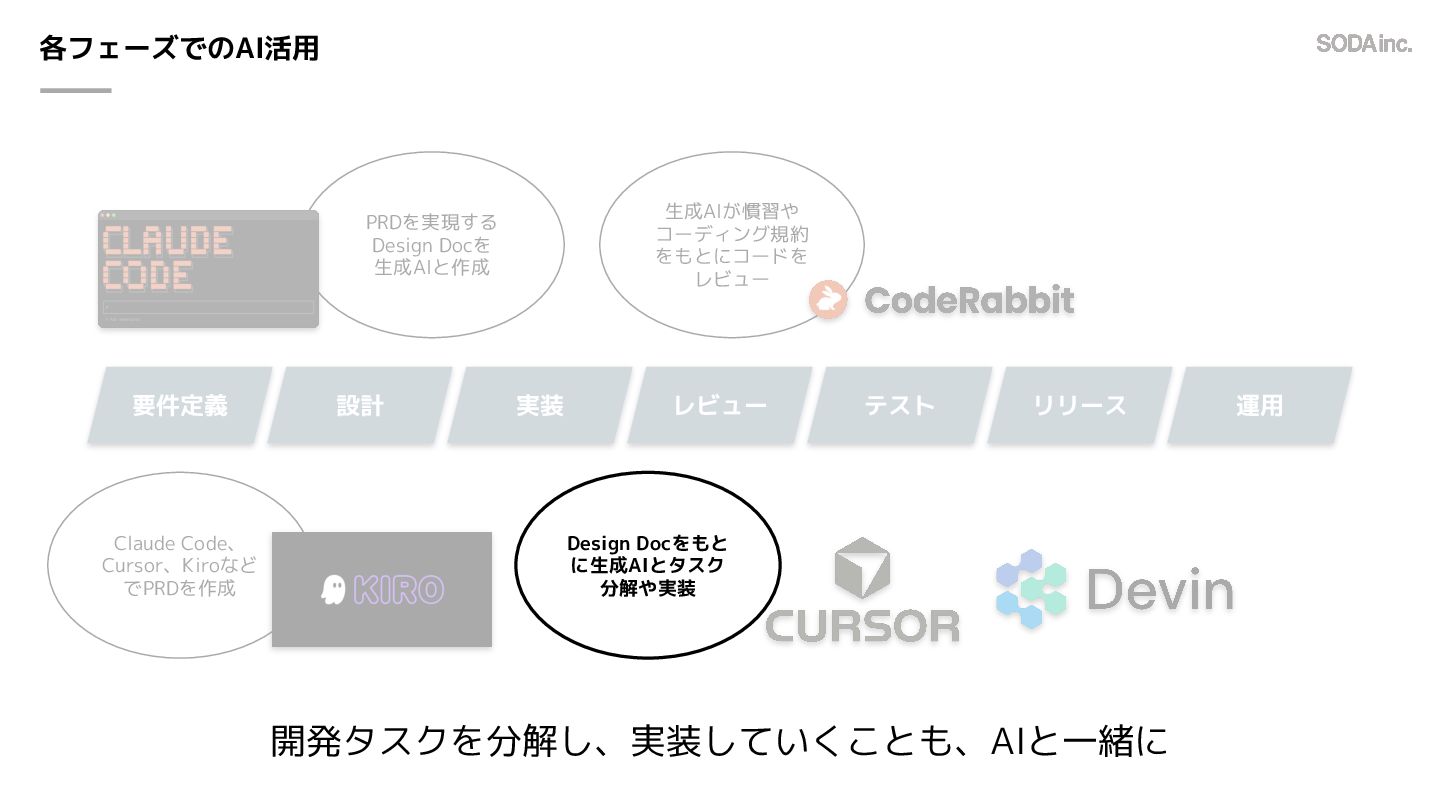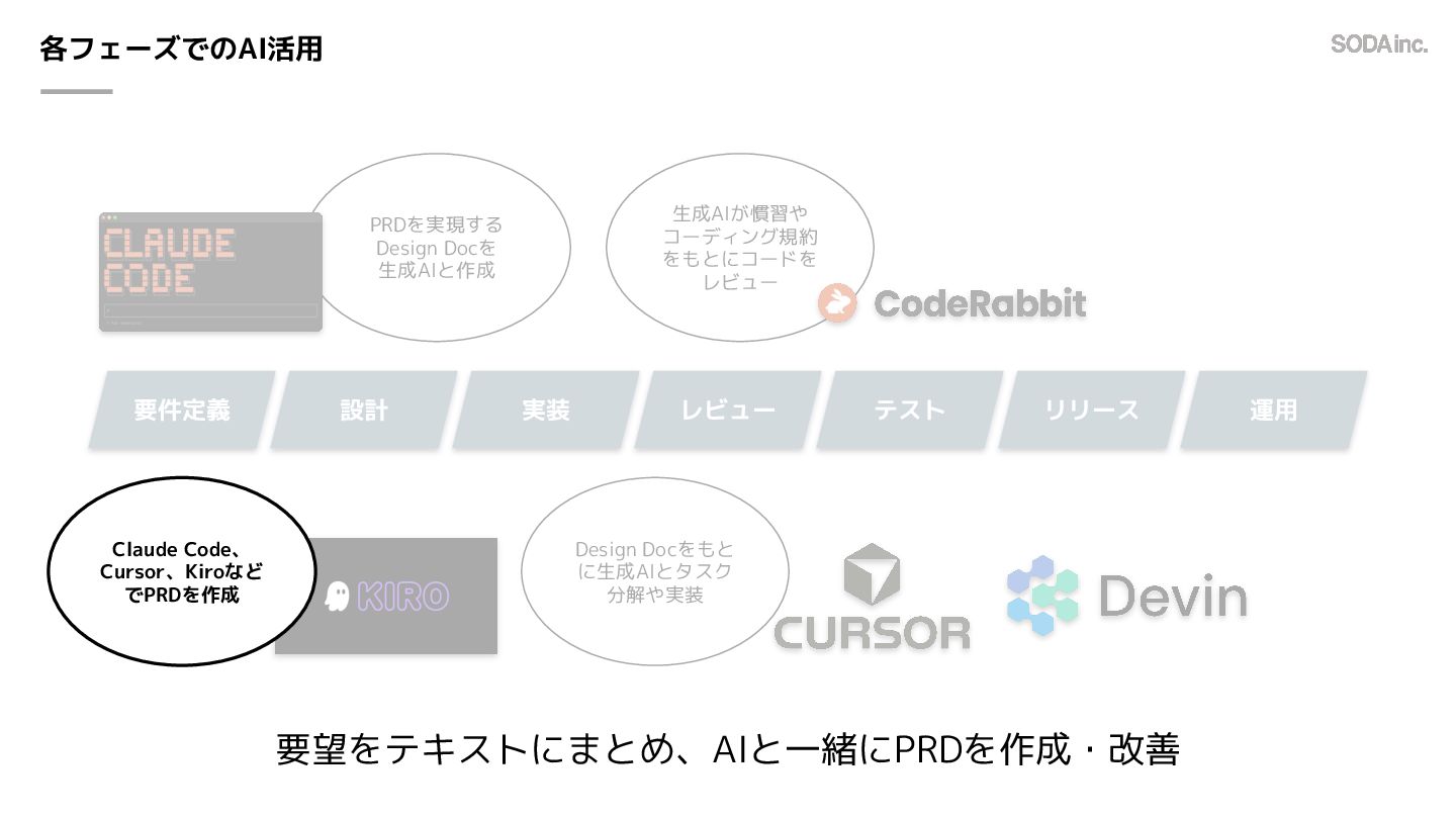 運用 PRDを実現する Design Docを 生成AIと作成 生成AIが慣習や コーディング規約 をもとにコードを レビュー 各フェーズでのAI活用 Claude Code、 Cursor、Kiroなど でPRDを作成 要望をテキストにまとめ、AIと一緒にPRDを作成・改善