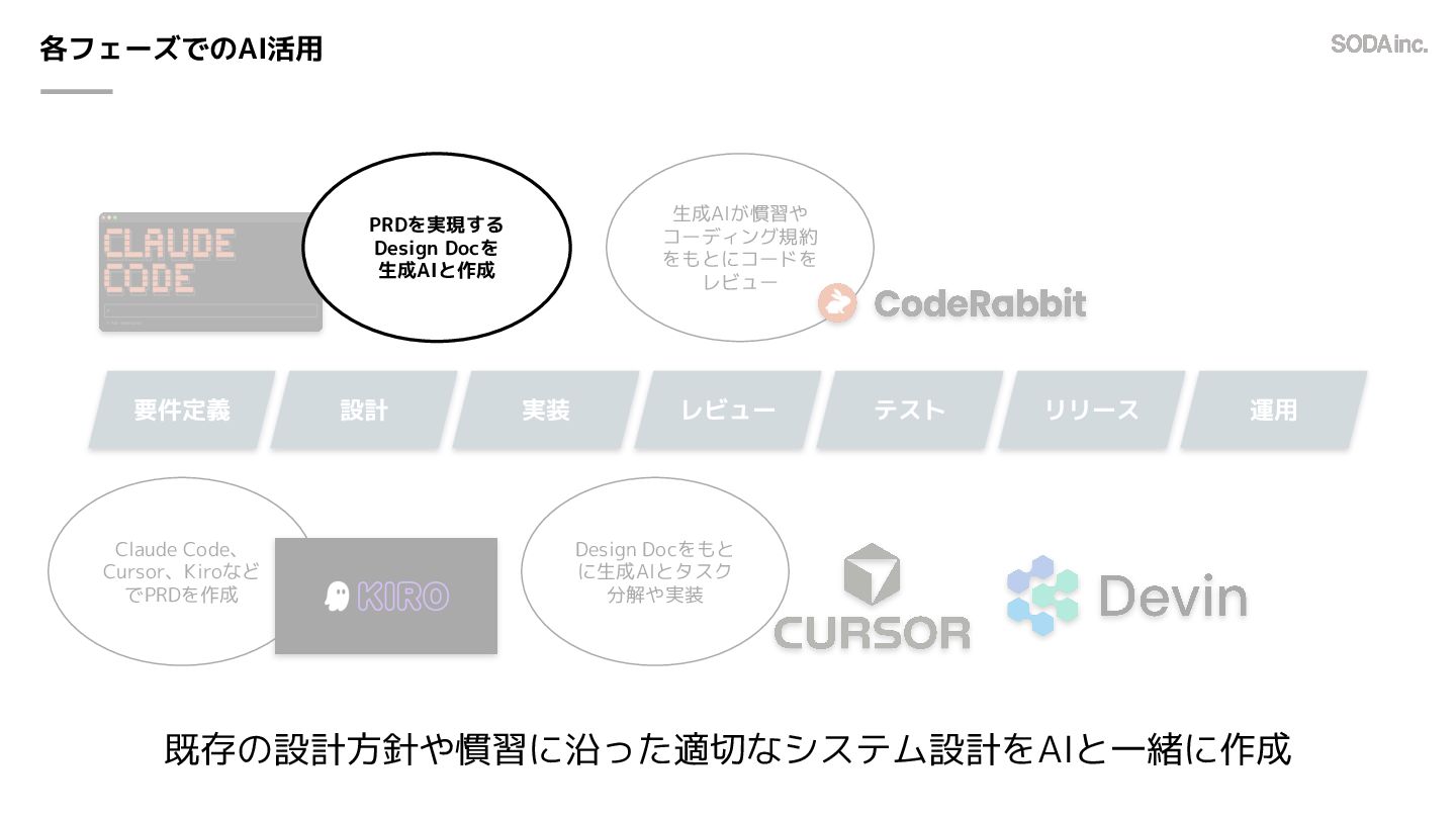 PRDを実現する Design Docを 生成AIと作成 Claude Code、 Cursor、Kiroなど でPRDを作成 要件定義 設計