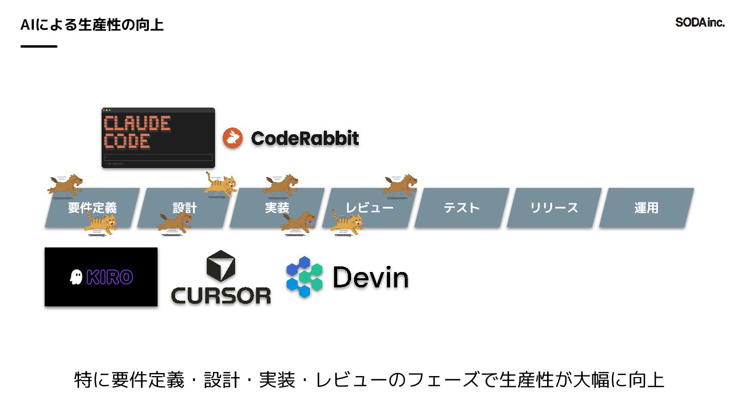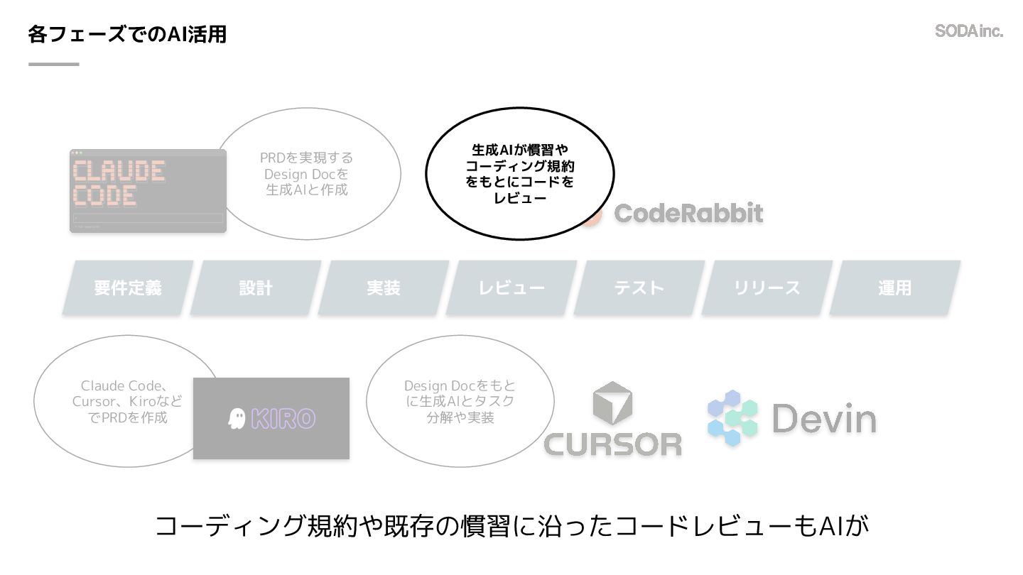 Cursor、Kiroなど でPRDを作成 要件定義 設計 実装 レビュー テスト リリース 運用 各フェーズでのAI活用 コーディング規約や既存の慣習に沿ったコードレビューもAIが 生成AIが慣習や コーディング規約 をもとにコードを レビュー