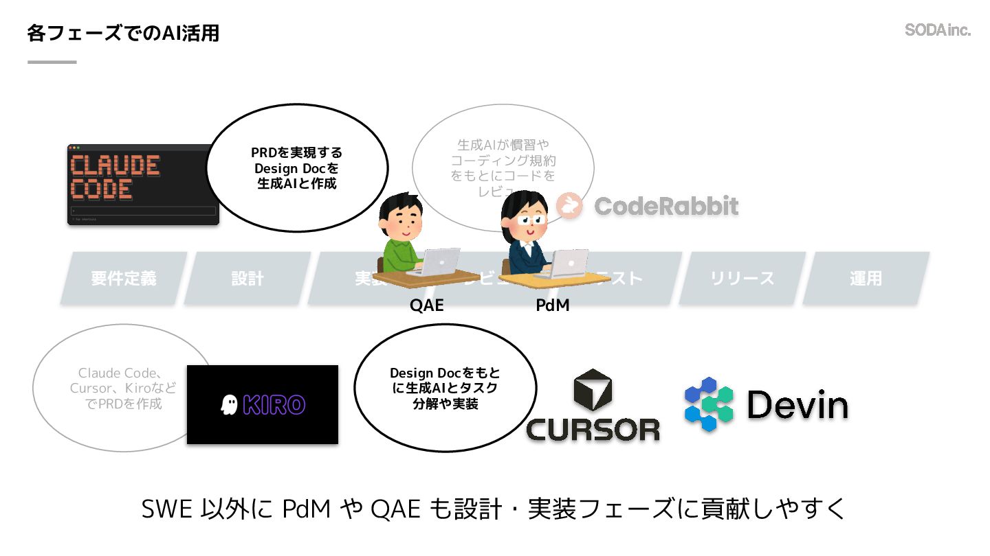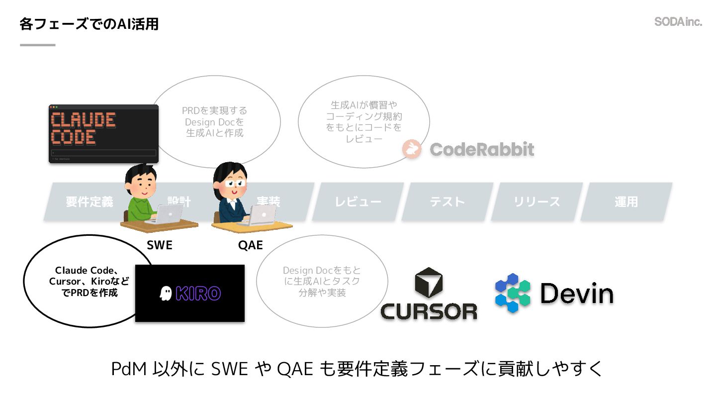 分解や実装 PRDを実現する Design Docを 生成AIと作成 生成AIが慣習や コーディング規約 をもとにコードを レビュー Claude Code、 Cursor、Kiroなど でPRDを作成 PdM 以外に SWE や QAE も要件定義フェーズに貢献しやすく SWE QAE 各フェーズでのAI活用