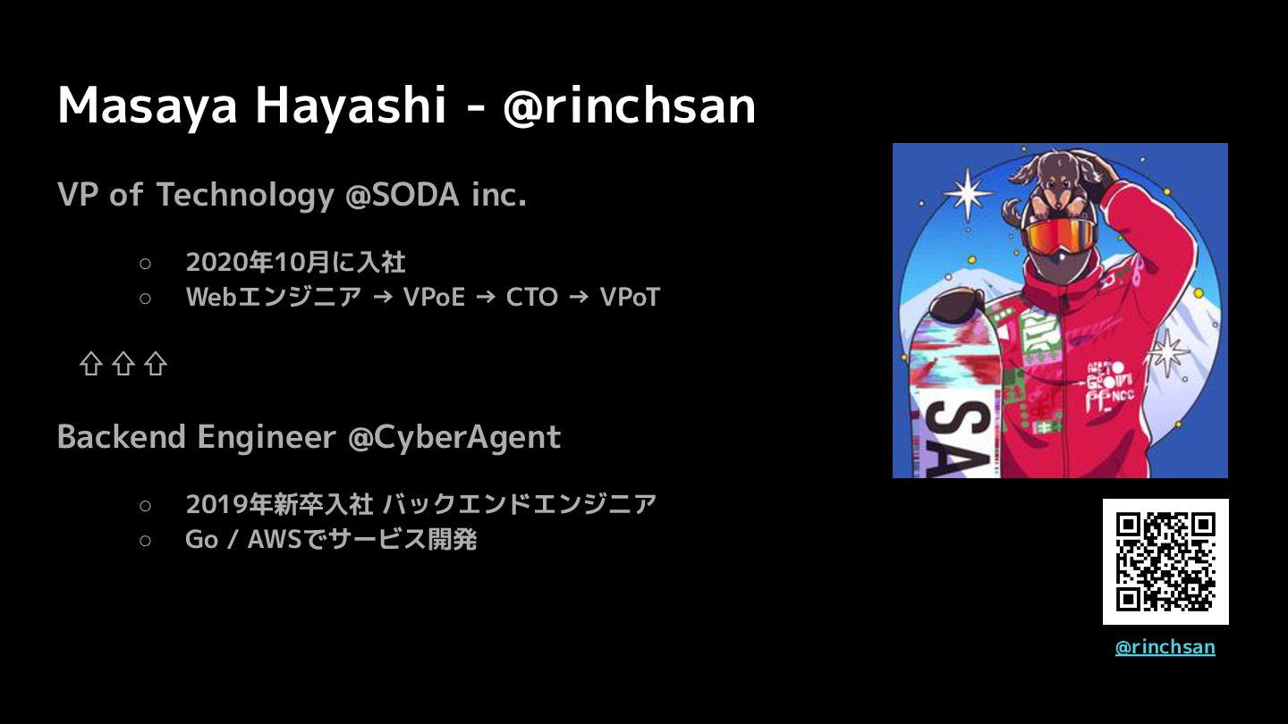 VPoE → CTO → VPoT ⇧⇧⇧ Backend Engineer @CyberAgent ◦ 2019年新卒入社 バックエンドエンジニア ◦ Go / AWSでサービス開発 Masaya Hayashi - @rinchsan @rinchsan