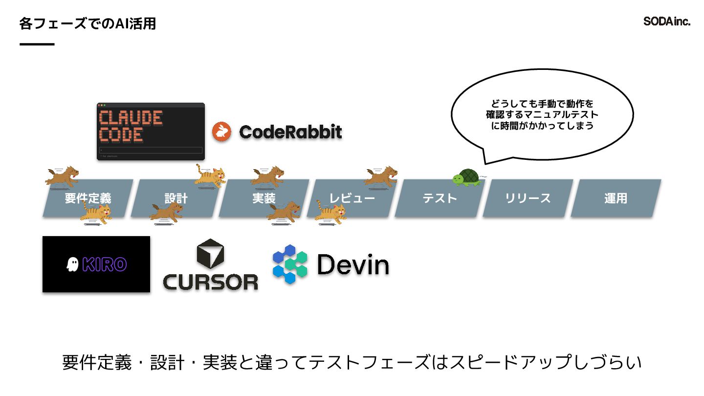 各フェーズでのAI活用 要件定義 設計 実装 レビュー テスト リリース 運用 要件定義・設計・実装と違ってテストフェーズはスピードアップしづらい どうしても手動で動作を