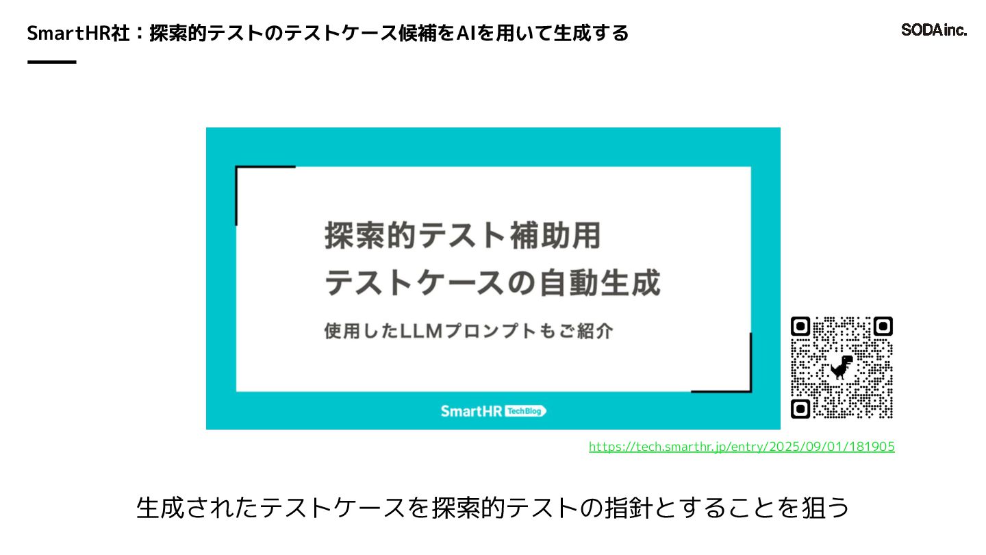 SmartHR社:探索的テストのテストケース候補をAIを用いて生成する https://tech.smarthr.jp/entry/2025/09/01/181905 生成されたテストケースを探索的テストの指針とすることを狙う