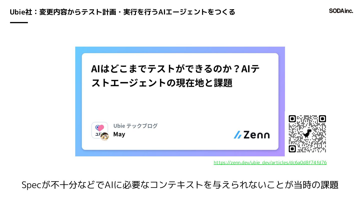 Ubie社:変更内容からテスト計画・実行を行うAIエージェントをつくる https://zenn.dev/ubie_dev/articles/dc6a0d8f74fd76 Specが不十分などでAIに必要なコンテキストを与えられないことが当時の課題