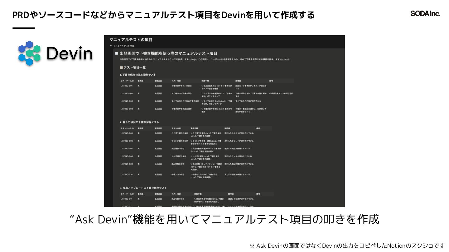 PRDやソースコードなどからマニュアルテスト項目をDevinを用いて作成する “Ask Devin”機能を用いてマニュアルテスト項目の叩きを作成 ※ Ask Devinの画面ではなくDevinの出力をコピペしたNotionのスクショです