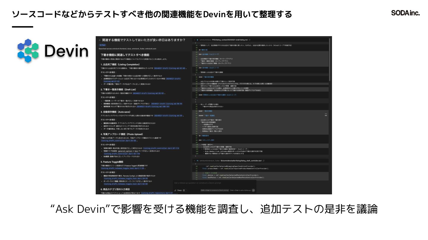 ソースコードなどからテストすべき他の関連機能をDevinを用いて整理する “Ask Devin”で影響を受ける機能を調査し、追加テストの是非を議論