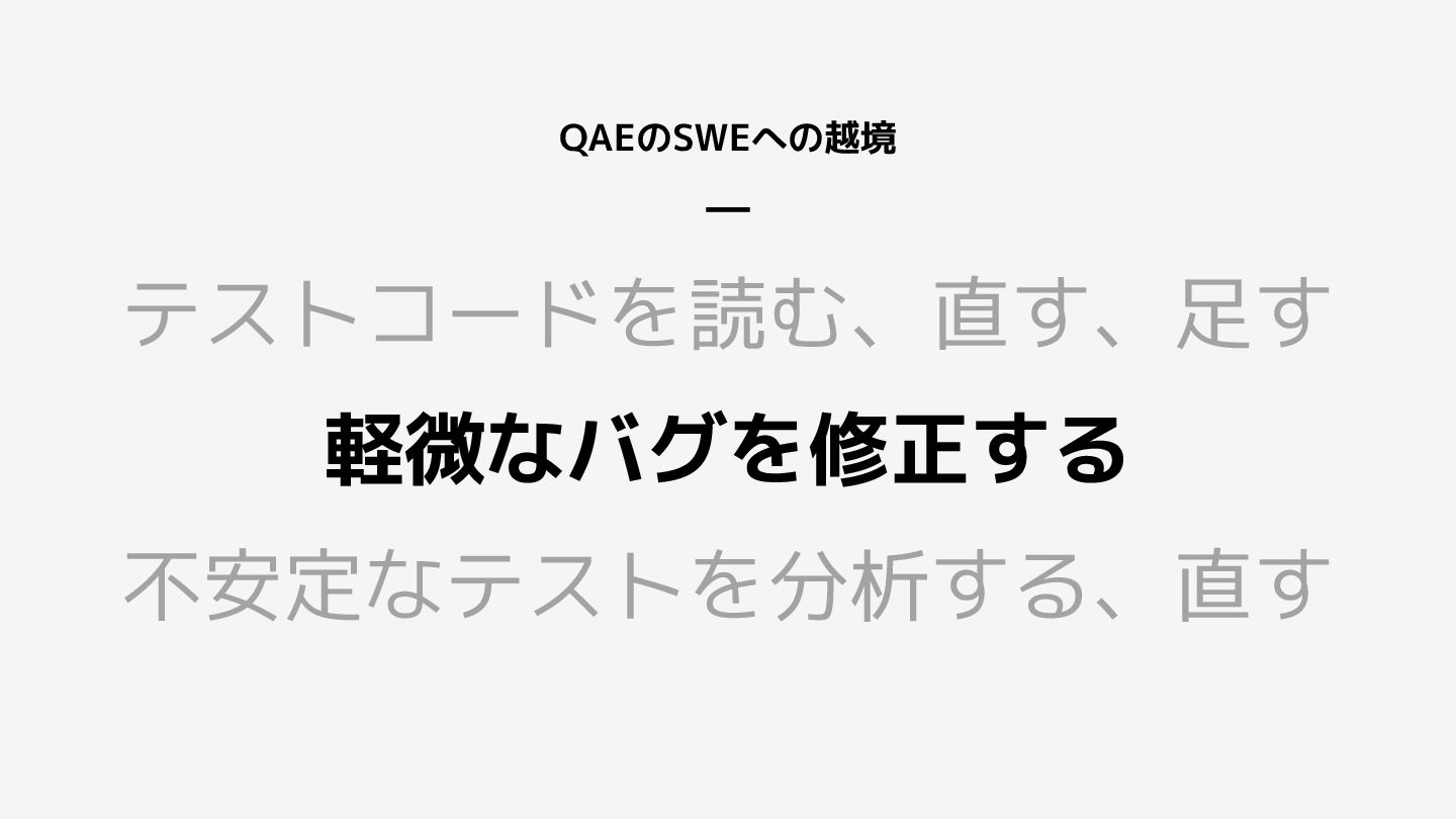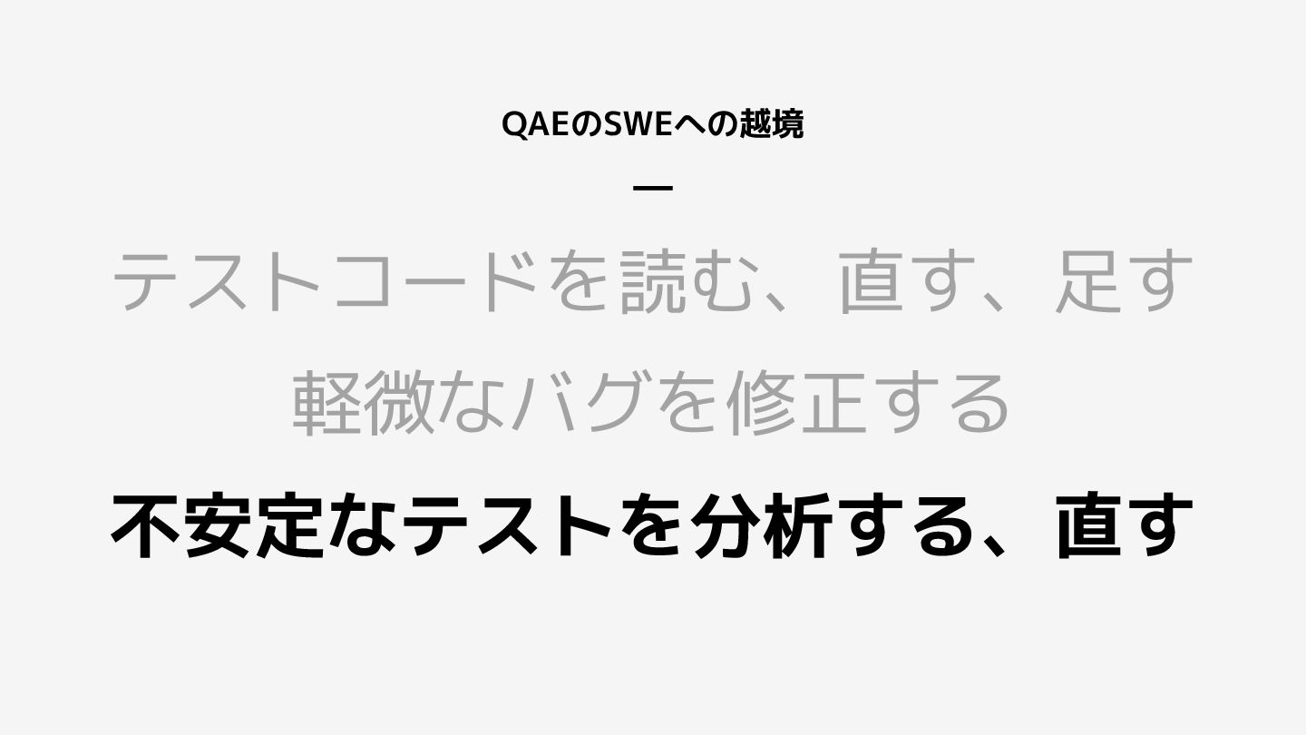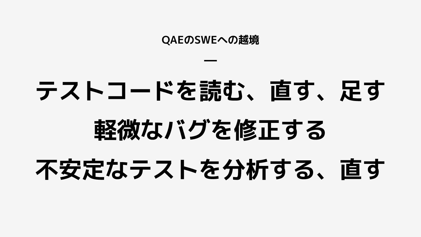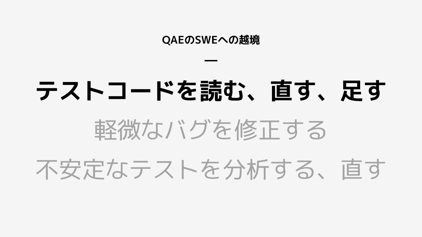 テストコードを読む、直す、足す 軽微なバグを修正する 不安定なテストを分析する、直す QAEのSWEへの越境
