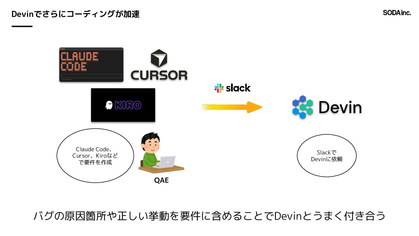 Claude Code、 Cursor、Kiroなど で要件を作成 バグの原因箇所や正しい挙動を要件に含めることでDevinとうまく付き合う QAE Devinでさらにコーディングが加速 Slackで Devinに依頼