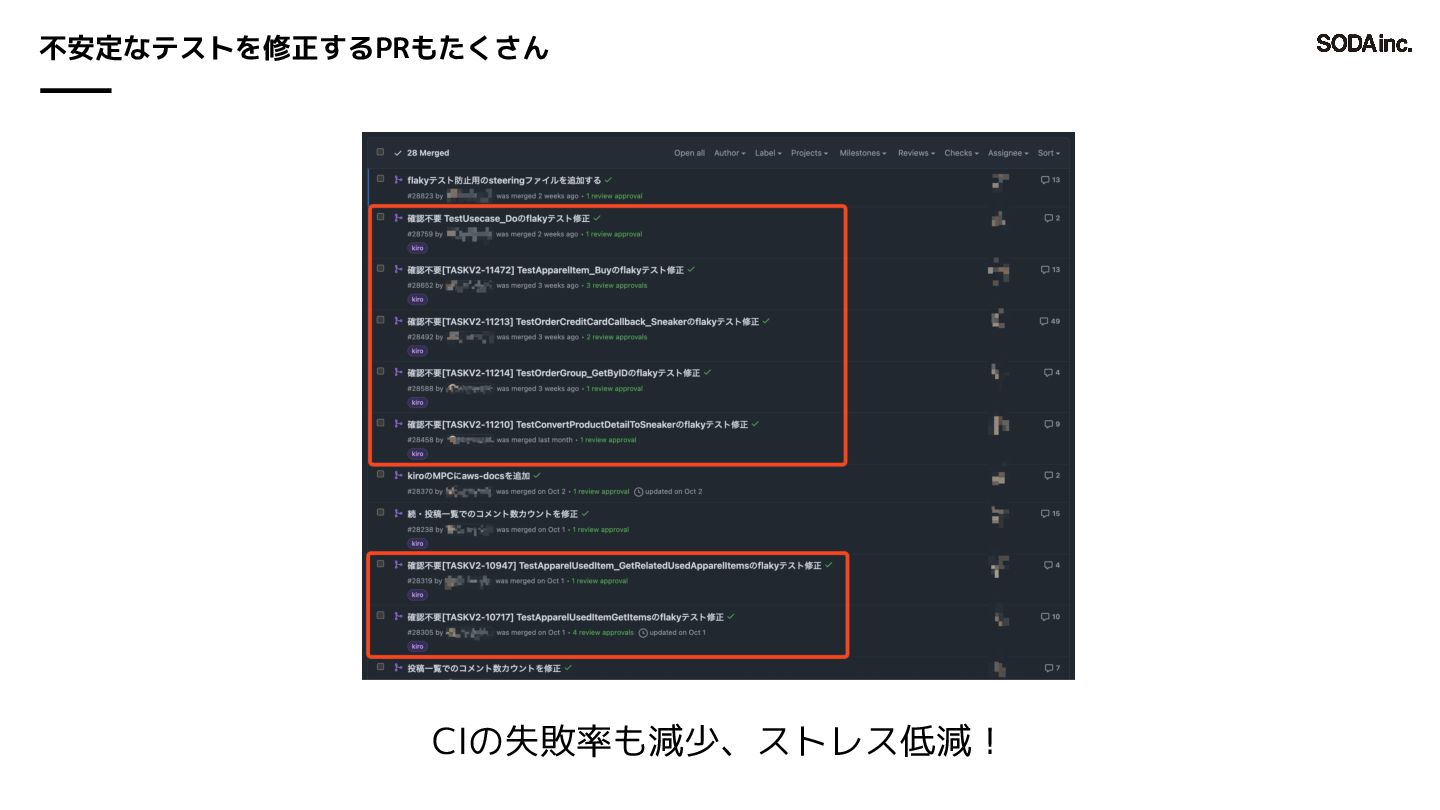 不安定なテストを修正するPRもたくさん CIの失敗率も減少、ストレス低減!
