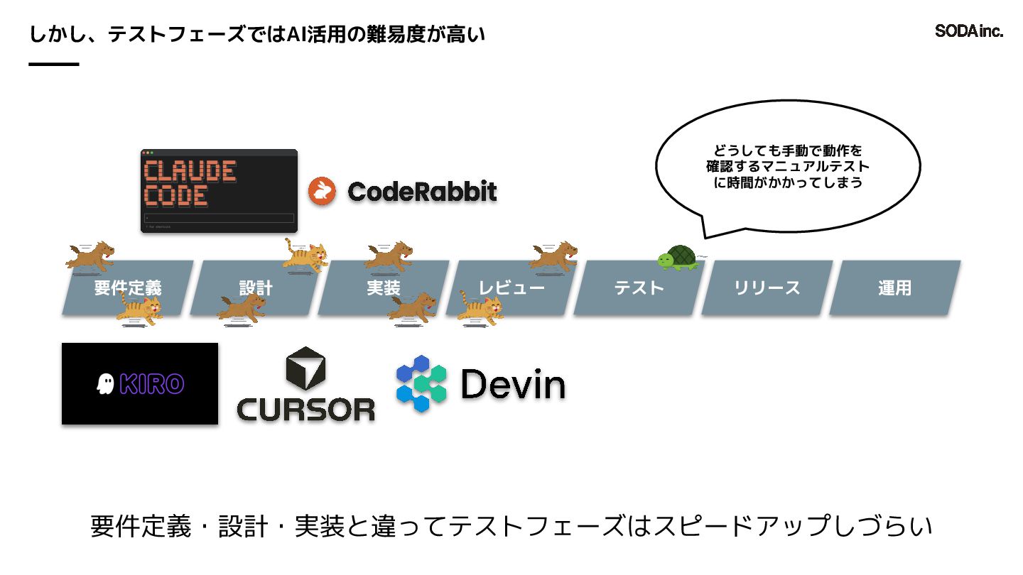 しかし、テストフェーズではAI活用の難易度が高い 要件定義 設計 実装 レビュー テスト リリース 運用 要件定義・設計・実装と違ってテストフェーズはスピードアップしづらい どうしても手動で動作を
