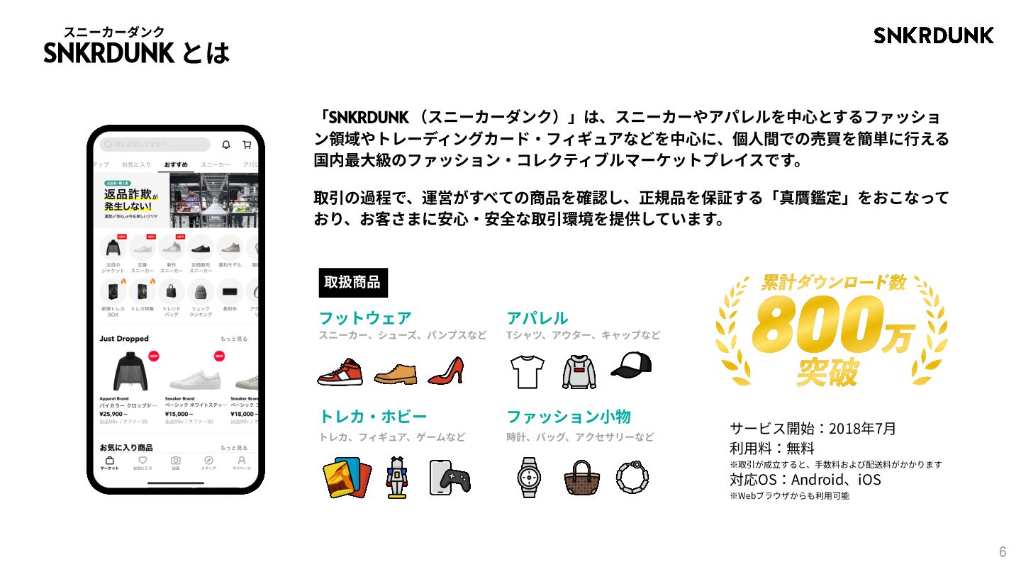 SNKRDUNK とは 「SNKRDUNK (スニーカーダンク)」は、スニーカーやアパレルを中⼼とするファッショ ン領域やトレーディングカード‧フィギュアなどを中⼼に、個⼈間での売買を簡単に⾏える 国内最⼤級のファッション‧コレクティブルマーケットプレイスです。 サービス開始:2018年7⽉ 利⽤料:無料 ※取引が成⽴すると、⼿数料および配送料がかかります 対応OS:Android、iOS