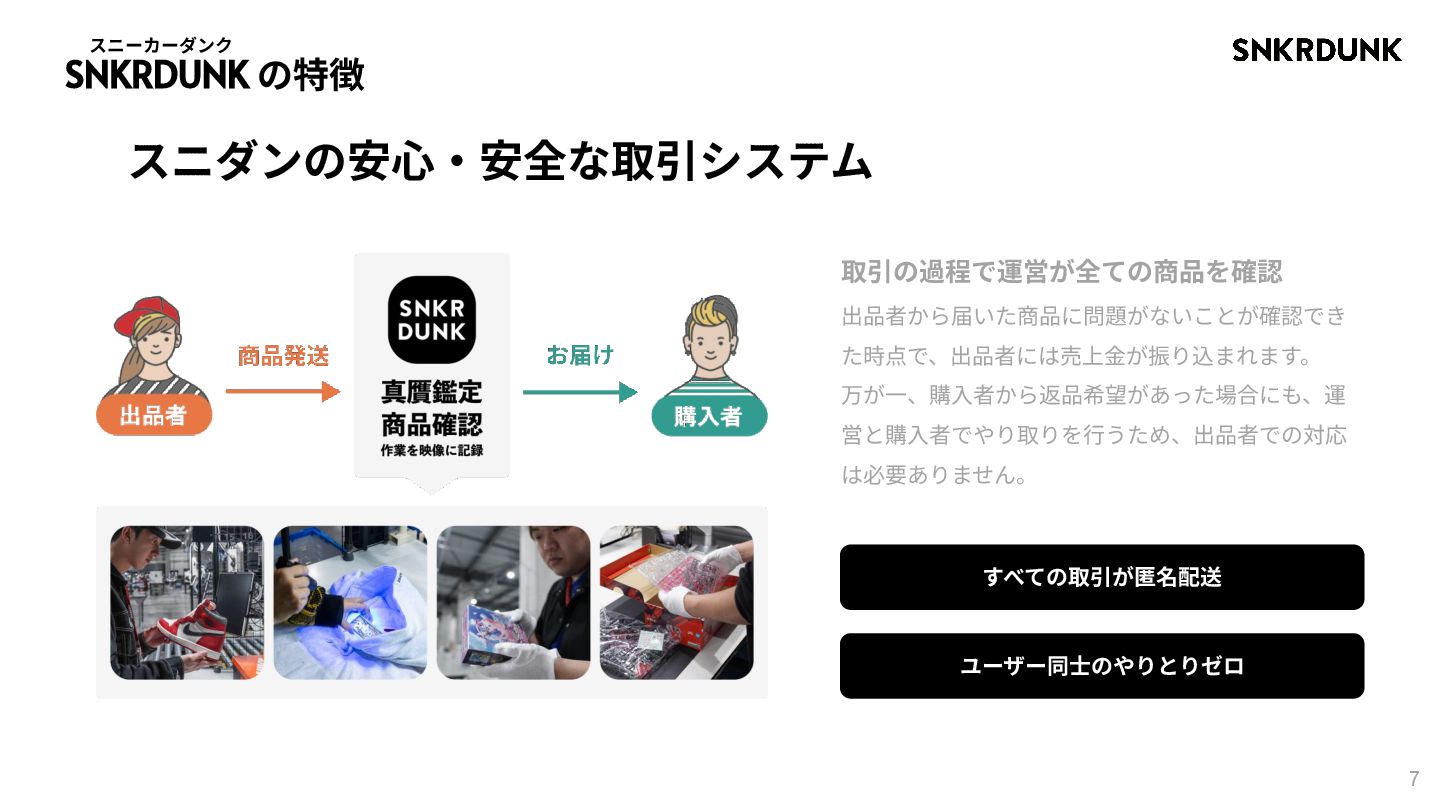 ※Webブラウザからも利⽤可能 6 スニーカーダンク 取扱商品 フットウェア スニーカー、シューズ、パンプスなど トレカ‧ホビー トレカ、フィギュア、ゲームなど アパレル Tシャツ、アウター、キャップなど ファッション⼩物 時計、バッグ、アクセサリーなど 取引の過程で、運営がすべての商品を確認し、正規品を保証する「真贋鑑定」をおこなって おり、お客さまに安⼼‧安全な取引環境を提供しています。
