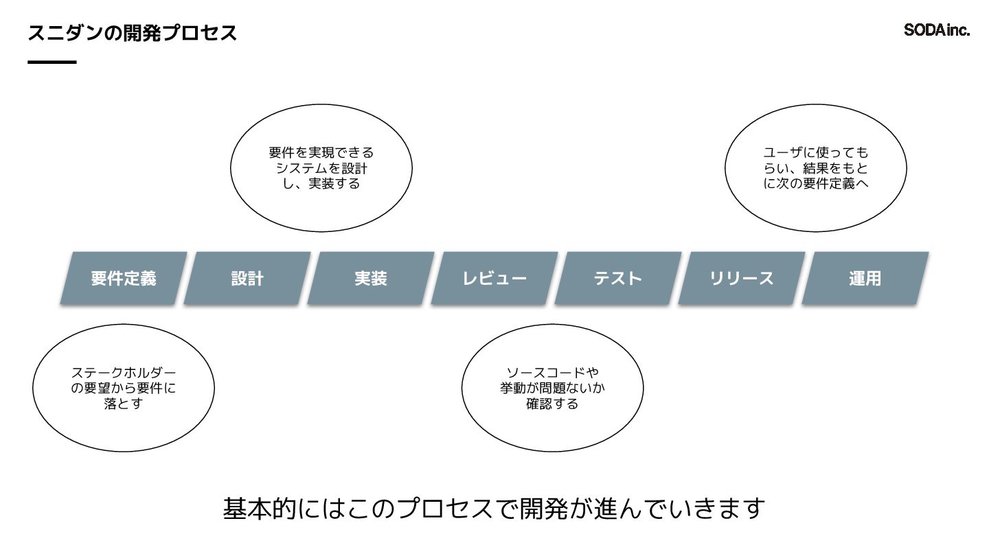 スニダンの開発プロセス ステークホルダー の要望から要件に 落とす 要件定義 設計 実装 レビュー テスト リリース