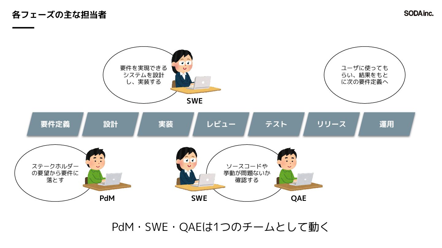 運用 要件を実現できる システムを設計 し、実装する ソースコードや 挙動が問題ないか 確認する ユーザに使っても らい、結果をもと に次の要件定義へ PdM・SWE・QAEは1つのチームとして動く PdM SWE QAE SWE