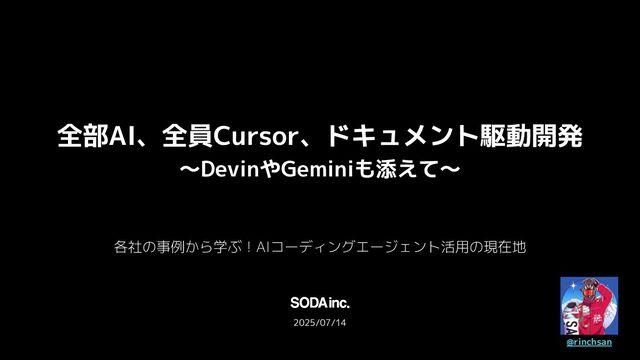 2025/07/14 各社の事例から学ぶ!AIコーディングエージェント活用の現在地 全部AI、全員Cursor、ドキュメント駆動開発 〜DevinやGeminiも添えて〜 @rinchsan