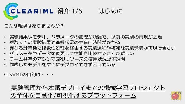 Reproducibility Orchestrate • 前処理/学習/評価など分割タスクをデコレータで装飾し、一連の処理として実行可能 • パイプライン自体のcloneとデータやパラメタを変更した実験の実行が可能 • 処理ごとに実行マシンを割り当て、個別にタスク実行が可能 from clearml.automation.controller import PipelineDecorator @PipelineDecorator.component(return_values=['data_frame'], cache=True) def step_one(pickle_data_url: str, extra: int = 43): import pickle import pandas as pd from clearml import StorageManager local_iris_pkl = StorageManager.get_local_copy(remote_url=pickle_data_url) with open(local_iris_pkl, 'rb') as f: iris = pickle.load(f) data_frame = pd.DataFrame(iris['data'], columns=iris['feature_names']) return data_frame