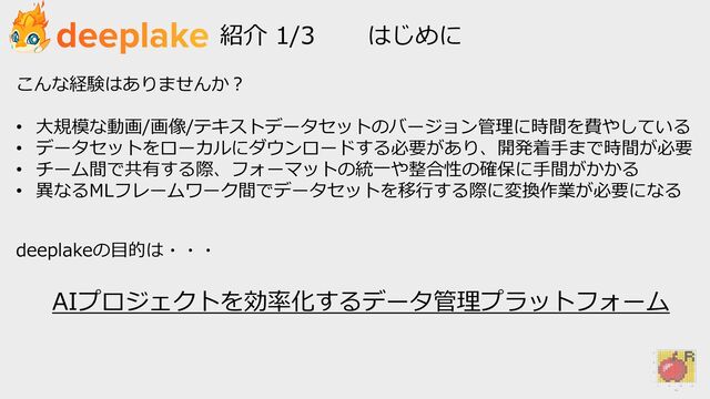※LLMフレームワーク(LlamaIndex, LangChain)や物体検知(MMDetection)等のオープンソースパッケージとのシームレスな接続も可能 import deeplake ds = deeplake.deepcopy(src_dataset_path, dest_dataset_path) ds = deeplake.load('./my_dataset_path') train_loader = ds.pytorch(num_workers = 8, transform = transform, batch_size = 32, tensors=['images', 'labels'], shuffle = True) train_loader = ds.tensorflow(...) 深層学習フレームワークとの接続