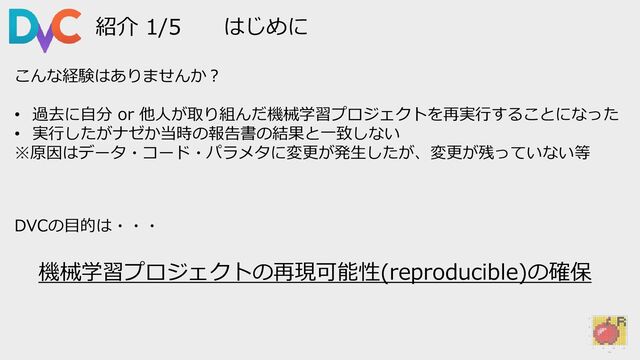 DVCの目的は・・・ 機械学習プロジェクトの再現可能性(reproducible)の確保 こんな経験はありませんか? • 過去に自分 or 他人が取り組んだ機械学習プロジェクトを再実行することになった • 実行したがナゼか当時の報告書の結果と一致しない ※原因はデータ・コード・パラメタに変更が発生したが、変更が残っていない等