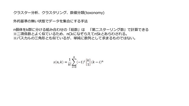 クラスター分析、クラスタリング、数値分類(toxonomy) 外的基準の無い状態でデータを集合にする手法 n個体をk群に分ける組み合わせの「総数」は 「第二スターリング数」で計算できる ※二項係数とよく似ているため、nCkになぞらえてnSkとあらわされる。 ※パスカルの三角形とも似ているが、単純に数列として求まるものではない。 , = 1 !