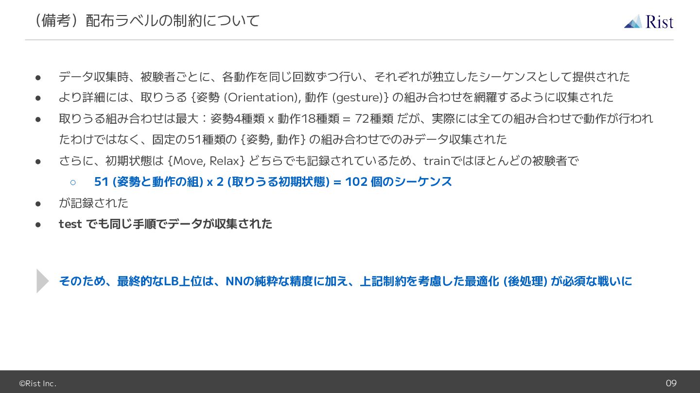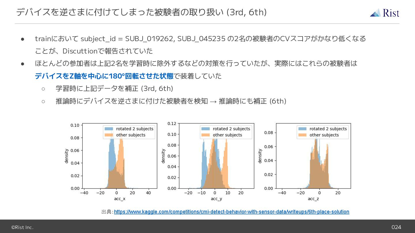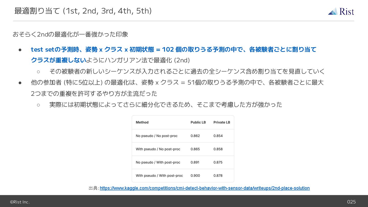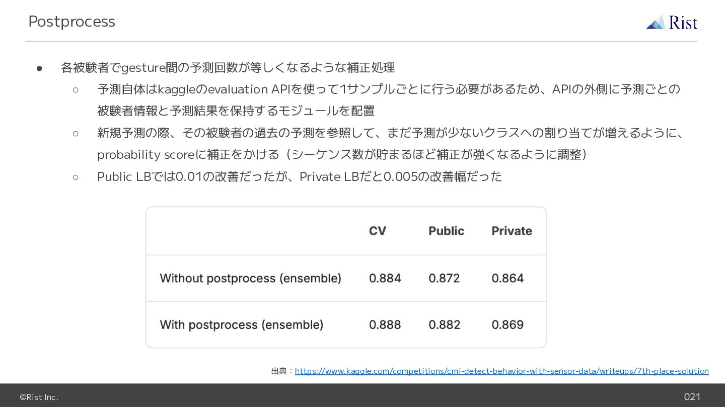 ◦ 新規予測の際、その被験者の過去の予測を参照して、まだ予測が少ないクラスへの割り当てが増えるように、 probability scoreに補正をかける(シーケンス数が貯まるほど補正が強くなるように調整) ◦ Public LBでは0.01の改善だったが、Private LBだと0.005の改善幅だった 出典:https://www.kaggle.com/competitions/cmi-detect-behavior-with-sensor-data/writeups/7th-place-solution