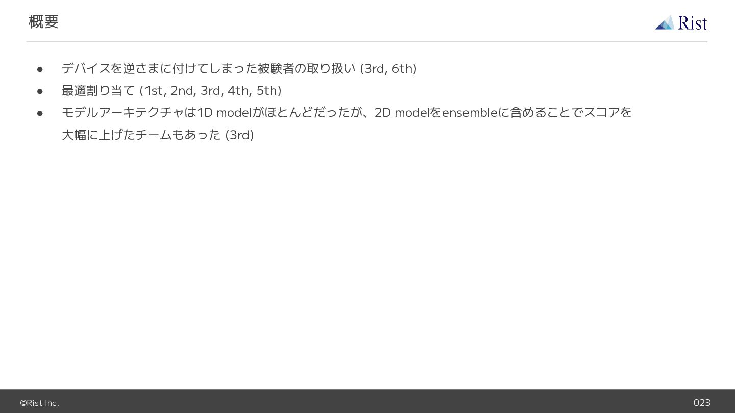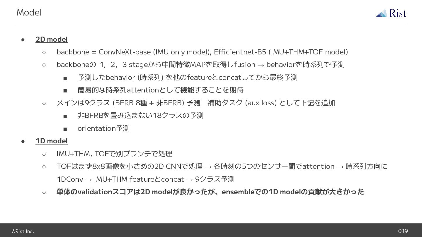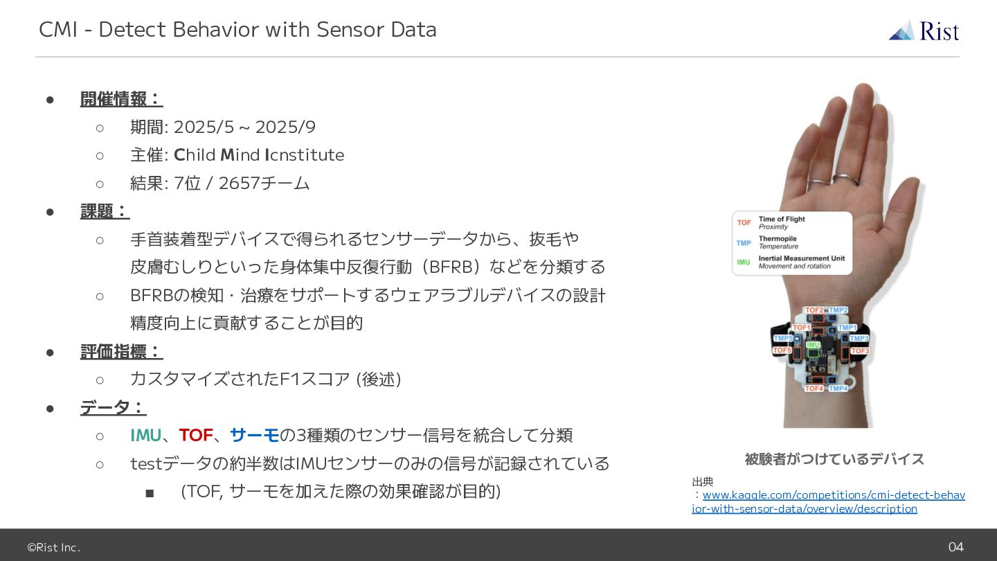 ◦ 新規予測の際、その被験者の過去の予測を参照して、まだ予測が少ないクラスへの割り当てが増えるように、 probability scoreに補正をかける(シーケンス数が貯まるほど補正が強くなるように調整) ◦ Public LBでは0.01の改善だったが、Private LBだと0.005の改善幅だった 出典:https://www.kaggle.com/competitions/cmi-detect-behavior-with-sensor-data/writeups/7th-place-solution