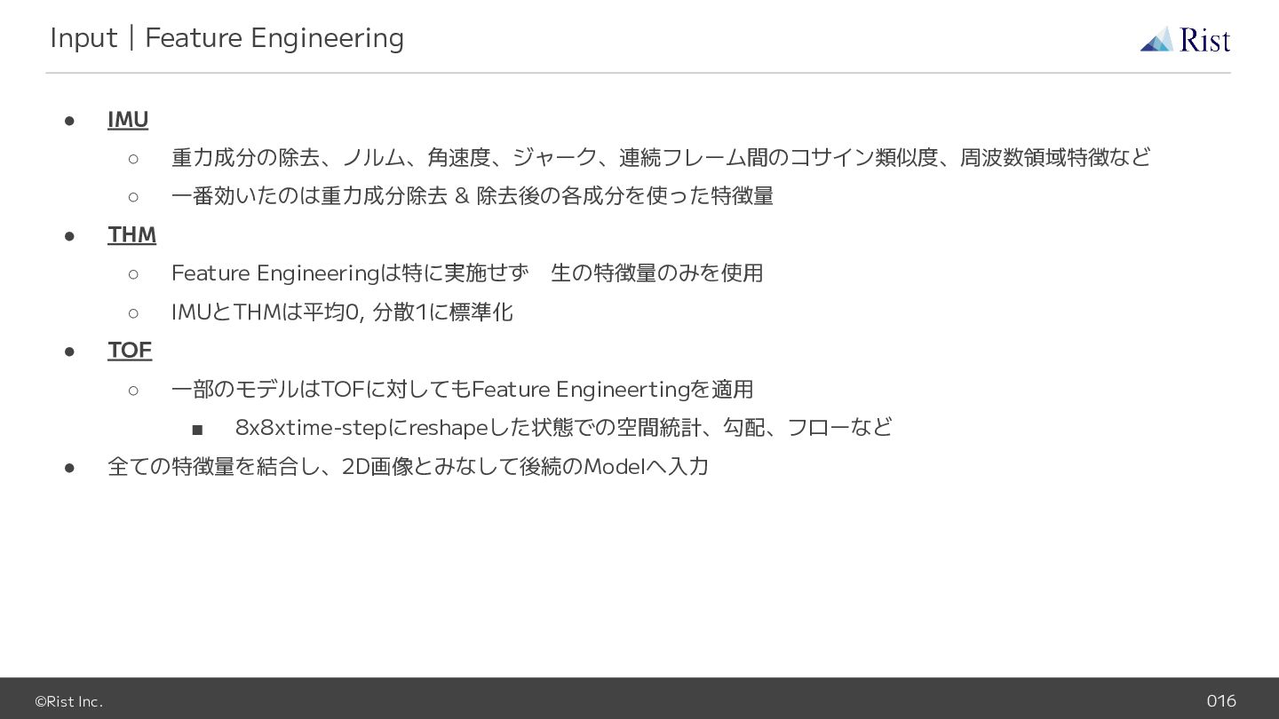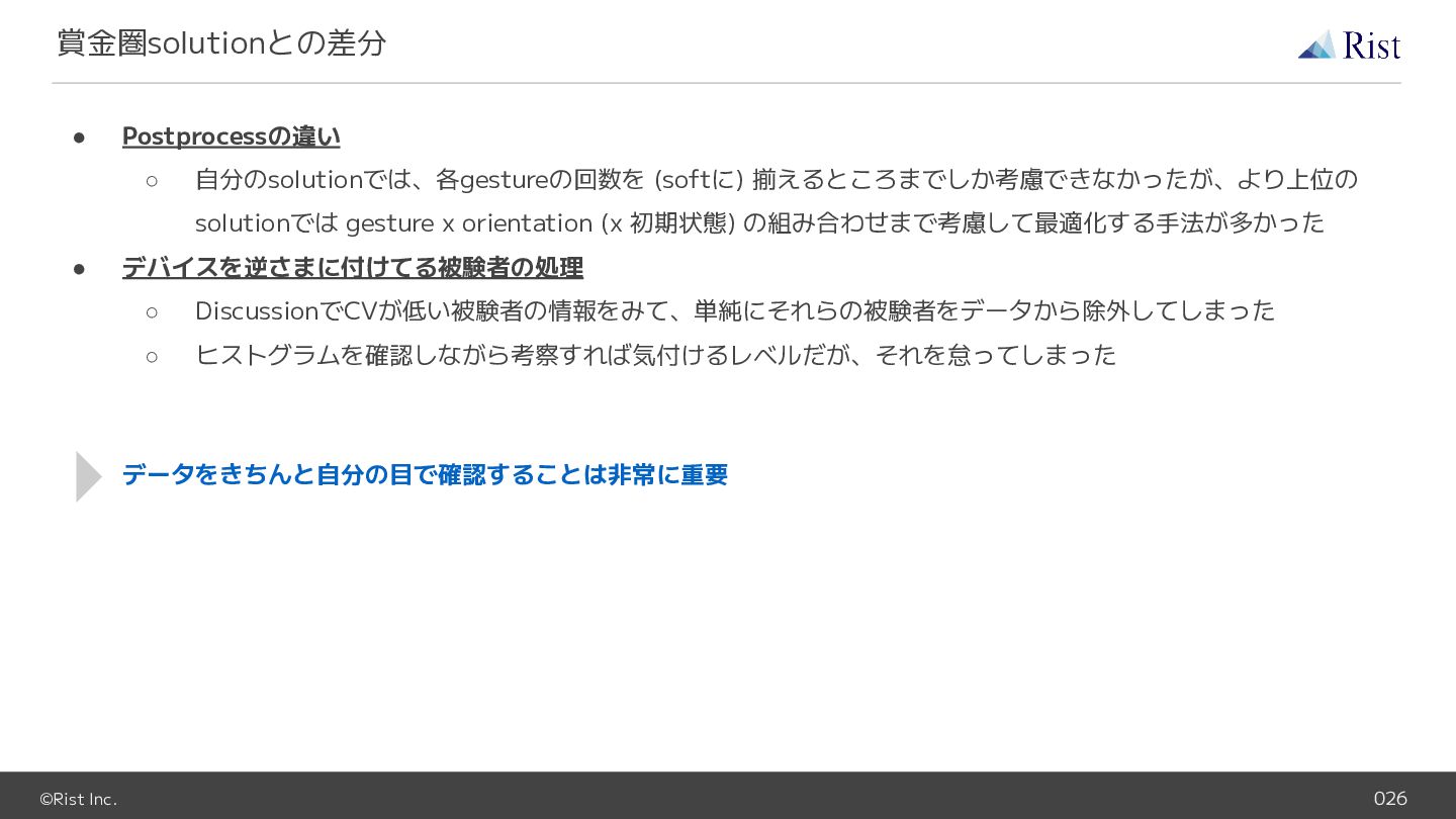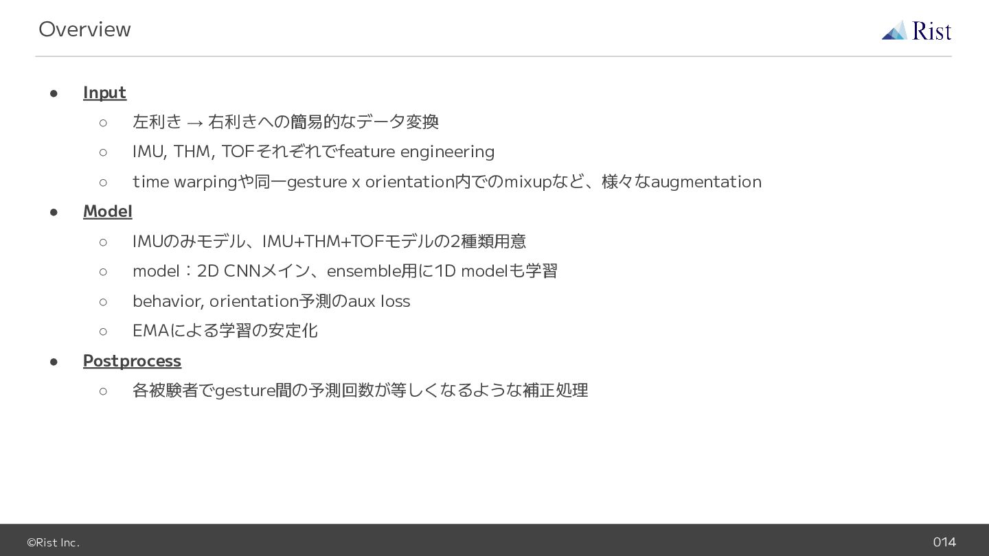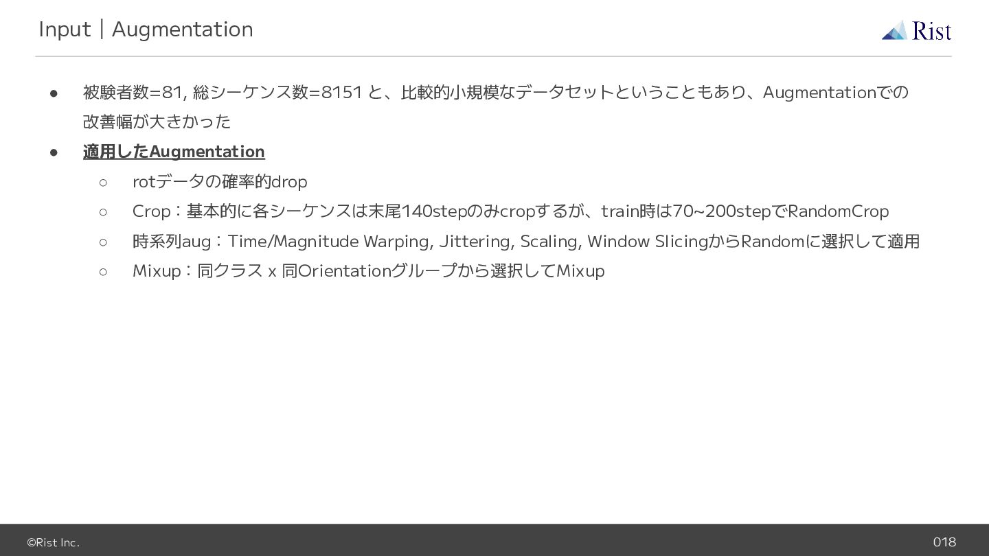 ◦ 新規予測の際、その被験者の過去の予測を参照して、まだ予測が少ないクラスへの割り当てが増えるように、 probability scoreに補正をかける(シーケンス数が貯まるほど補正が強くなるように調整) ◦ Public LBでは0.01の改善だったが、Private LBだと0.005の改善幅だった 出典:https://www.kaggle.com/competitions/cmi-detect-behavior-with-sensor-data/writeups/7th-place-solution