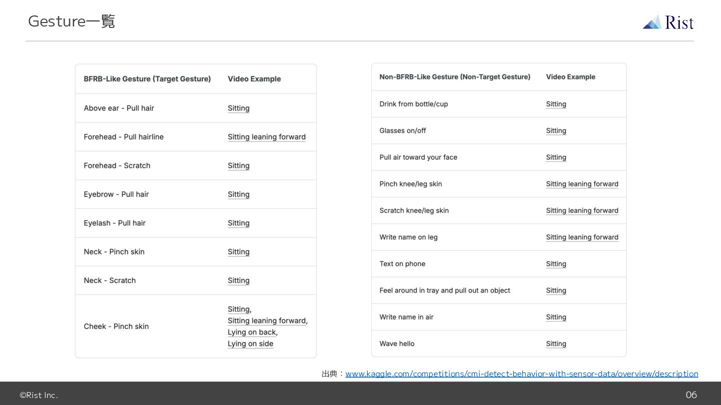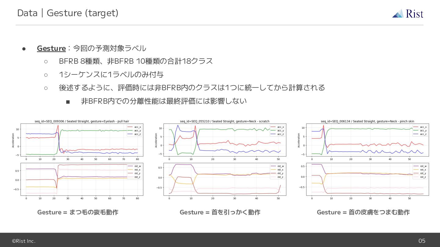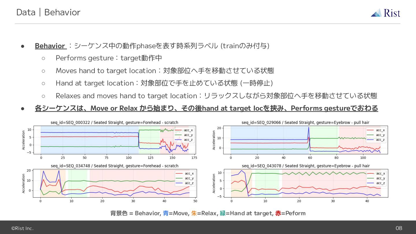 gesture:target動作中 ◦ Moves hand to target location:対象部位へ手を移動させている状態 ◦ Hand at target location:対象部位で手を止めている状態 (一時停止) ◦ Relaxes and moves hand to target location:リラックスしながら対象部位へ手を移動させている状態 • 各シーケンスは、Move or Relax から始まり、その後hand at target locを挟み、Performs gestureでおわる 背景色 = Behavior, 青=Move, 朱=Relax, 緑=Hand at target, 赤=Peform