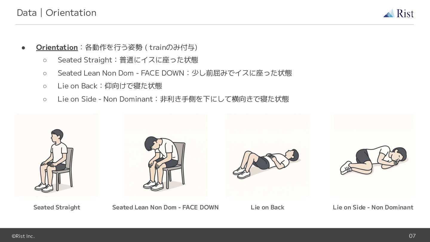 Straight:普通にイスに座った状態 ◦ Seated Lean Non Dom - FACE DOWN:少し前屈みでイスに座った状態 ◦ Lie on Back:仰向けで寝た状態 ◦ Lie on Side - Non Dominant:非利き手側を下にして横向きで寝た状態 Seated Straight Seated Lean Non Dom - FACE DOWN Lie on Back Lie on Side - Non Dominant