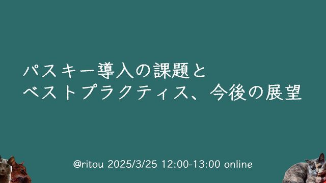 パスキー導 入 の課題と ベストプラクティス、今後の展望 @ritou 2025/3/25 12:00-13:00 online