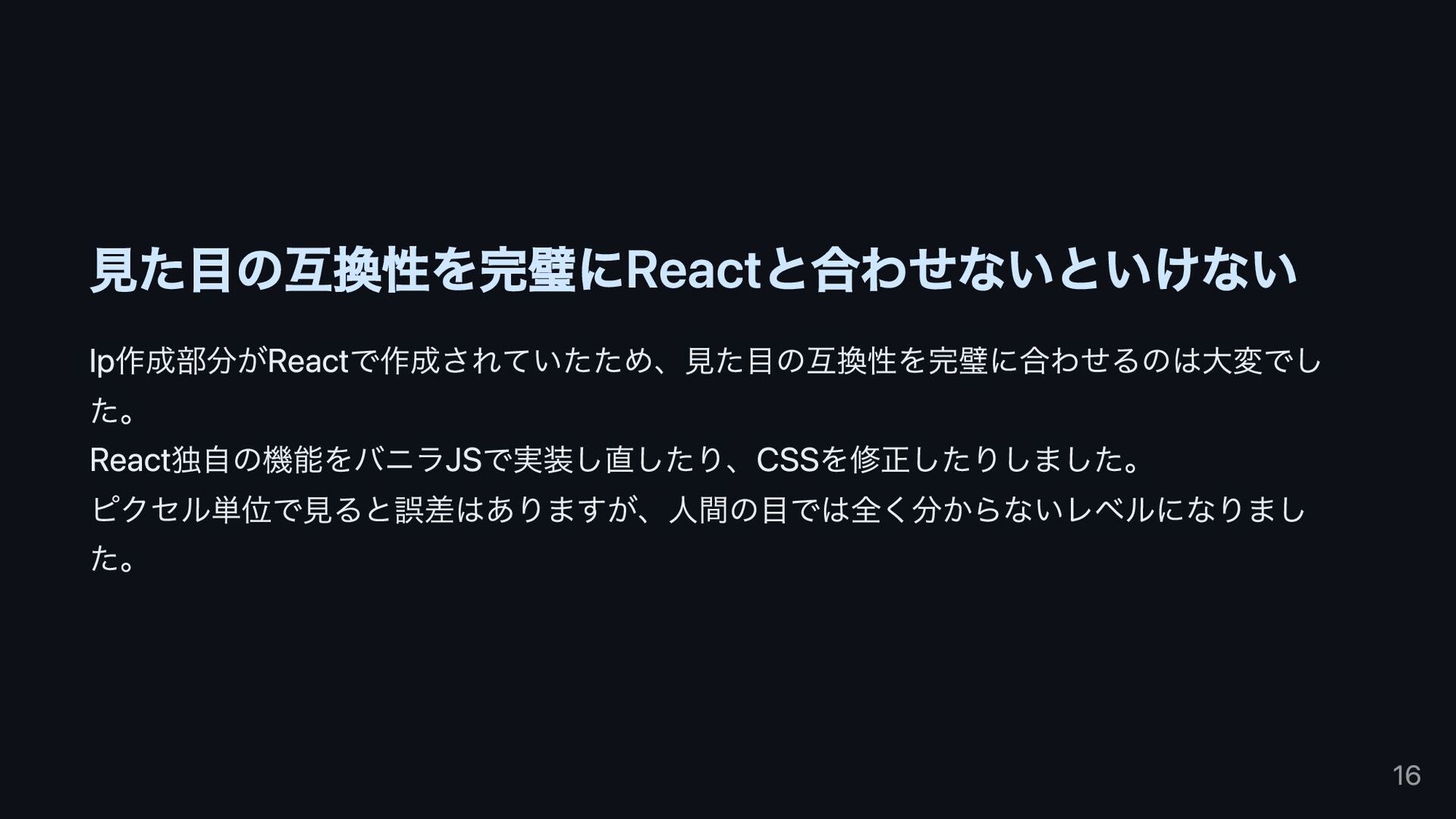 見た目の互換性を完璧にReactと合わせないといけない lp作成部分がReactで作成されていたため、見た目の互換性を完璧に合わせるのは大変でし た。 React独自の機能をバニラJSで実装し直したり、CSSを修正したりしました。 ピクセル単位で見ると誤差はありますが、人間の目では全く分からないレベルになりまし た。 16