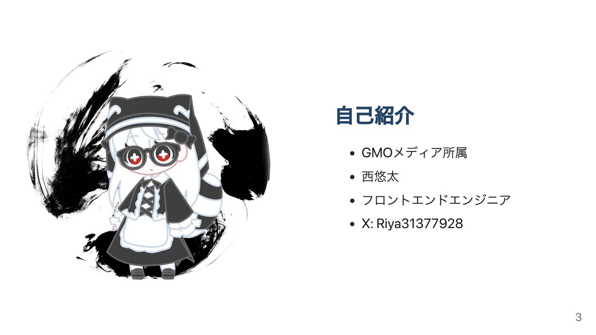 自己紹介 GMOメディア所属 西悠太 フロントエンドエンジニア X: Riya31377928 3