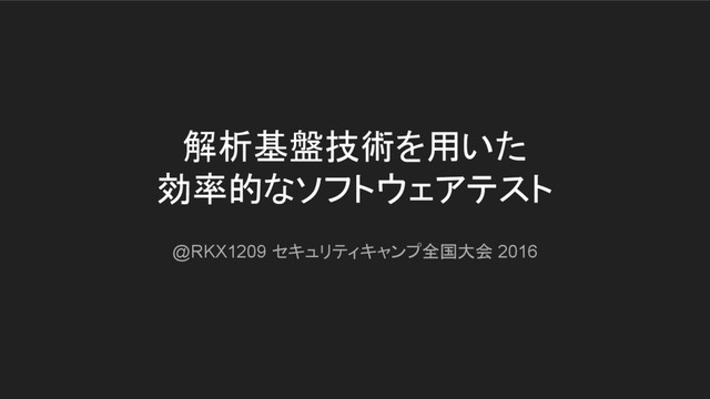 Fuzzing コードカバレッジの高い入力データを生成、利用する Fuzzing。 AFLやsyzkallerなどがある。 Charlie Miller, “Fuzzing with Code Coverage By Example” [ToorCon07] ❏ Conclic testing, Under-constrained symbolic execution コードの分岐条件制約とした 充足可能性問題を解き実行経路を検出する。 この際、一部を実行して具体的な値を利用する事で計算量爆発に対処する。 Koushik Sen et al, “CUTE: A Concolic Unit Testing Engine for C” [ESEC13] D.A. Ramos et al, “Under-Constrained Symbolic Execution: Correctness...” [USENIX15]