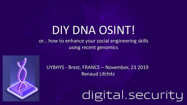 The first whole human genome sequencing took years of effort and cost about 2.2 billion euros in 2003. Today it takes a few weeks and a few hundreds euros to get your own (or someone else's!) DNA sequenced. More than 20 millions of US citizens have already sequenced their DNA and several hundreds of raw DNA files are available through the Web, sometimes without their owner's consent... Even if DNA is not a completely documented format, many things can be found against people having their DNA exposed. What are today's tools to study DNA? Are they freely available? What can you really find about somebody? How is it related to information security? Learn many things about you in this first of its kind talk!
