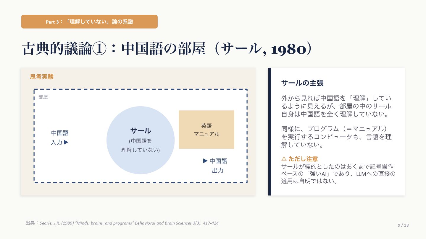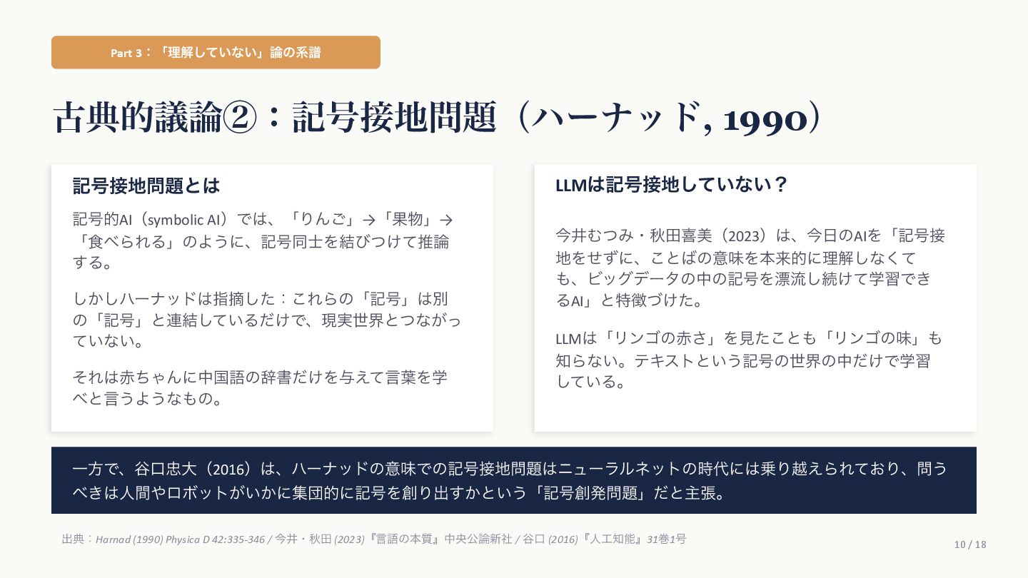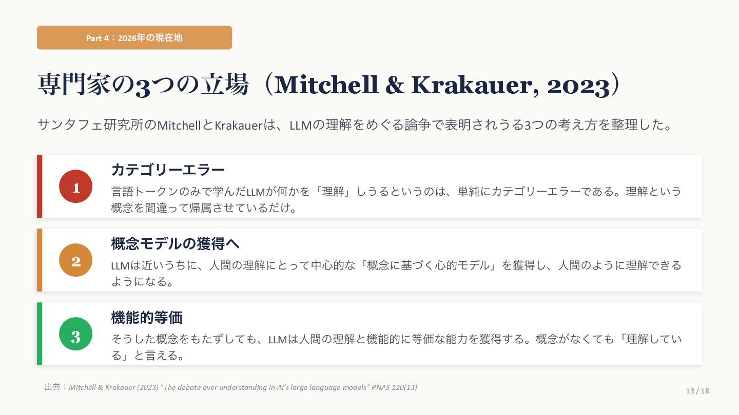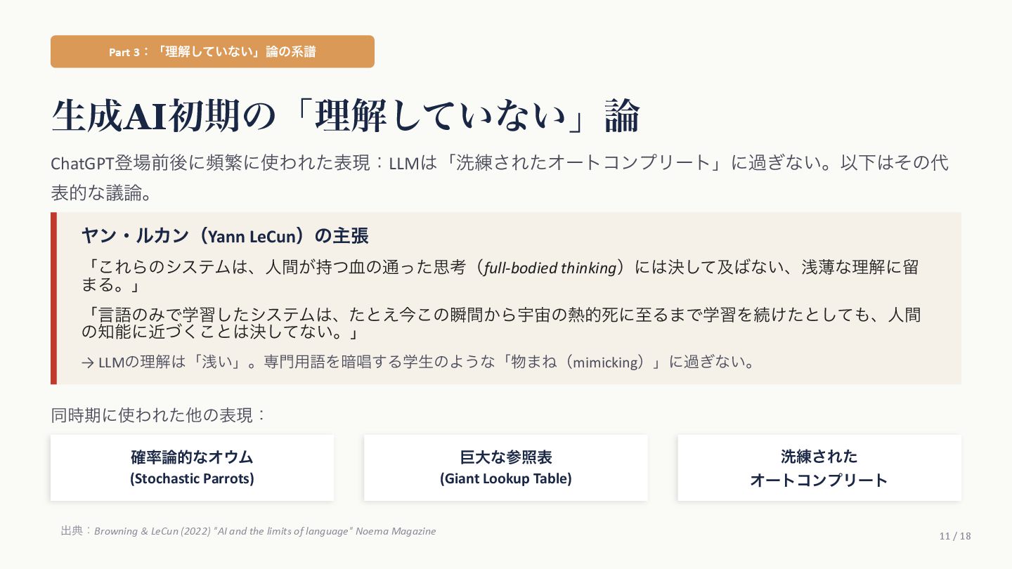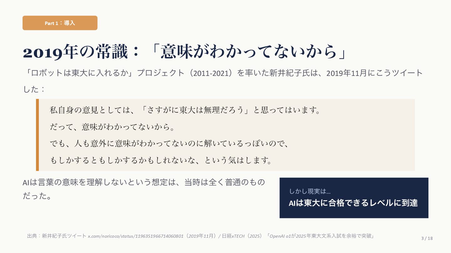 Agüera y ArcasࢯɺAIʹؔ͢Δߟ͑ํ͕2019ࠒʹมΘͬͨͱड़͍ͯ Δɻ ֩৺తͳཧ ① ςΩετ༧ଌAIશʢAI-completeʣͳͰ͋Δ ɹͲΜͳʮʢ͍͠ʣͷ͑ʊʊʯͷϓϩϯϓτܗࣜͰఏࣔͰ͖Δ͔Βɻ ② ڻ͖͘͜ͱʹɺ࣍୯ޠ༧ଌͷ܇࿅Ͱ࣮ࡍʹͦ͏ͨ͠ೳྗ͕ग़ݱͨ͠ ③ LLMຊͷೳͰͳ͍ͱ͍͏ਓ͕͍Δ͕ɺ͜ΕʮᣐͰΨΤϧݱʯ ɹࢲͨͪࣗɺڊେܭࢉʹΑΔ༧ଌϚγϯʢmassively computationally-scaled predictorʣͳͷͩɻ → Agüera y Arcasࢯͷ݁ɿզʑ͢ͰʹAGIʢ൚༻ਓೳʣΛखʹ͍ͯ͠Δɻ ग़యɿAgüera y Arcas (2025) What Is Intelligence? MIT Press / 202510݄౦ژߨԋʢචऀௌߨɿrmaruy.hatenablog.comʣ