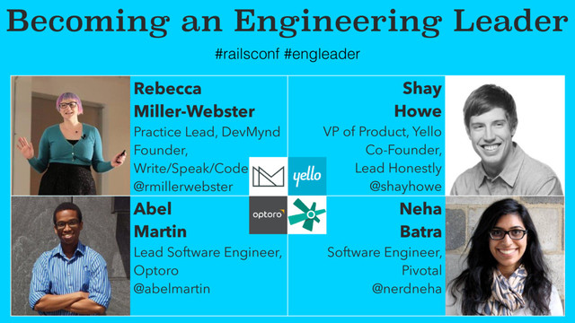 Write/Speak/Code @rmillerwebster Shay Howe VP of Product, Yello Co-Founder, Lead Honestly @shayhowe Abel Martin Lead Software Engineer, Optoro @abelmartin Neha Batra Software Engineer, Pivotal @nerdneha #railsconf #engleader