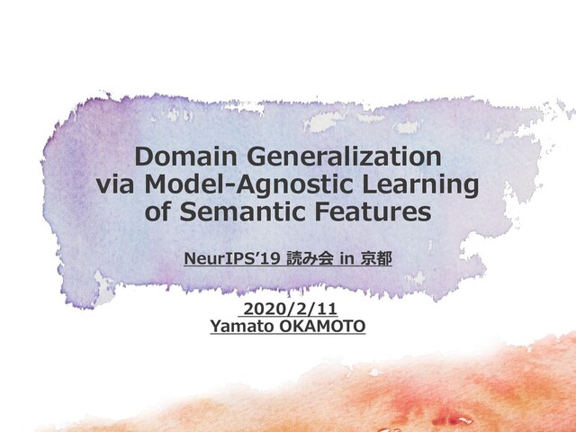 Jigsaw (CVPR’19) Feature-Critic (ICML’19) Semantic Feature (NeurIPS’19) C,P,Sで学習 Artで評価 67.63 64.89 70.35 A,P,Sで学習 Cartoonで評価 71.71 71.72 72.46 A,C,Sで学習 Photoで評価 89.00 89.94 90.68 A,C,Pで学習 Sketchで評価 65.18 61.85 67.33 Average 73.38 72.10 75.21 PACSデータで SoTA達成