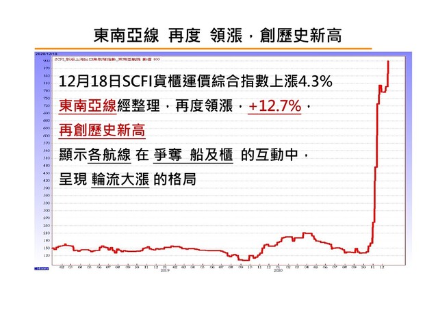 1,400 1,500 1,600 1,700 1,800 1,900 2,000 2,100 2,200 2,300 2,400 2,500 2,600 2,700 1月1日 2月1日 3月1日 4月1日 5月1日 6月1日 7月1日 8月1日 9月1日 10月1日 11月1日 12月1日 2018年SCFI運價綜合指數 2019年 2020年 2020年12月18日 單日 報價2,412,相較 2019年同期YoY +174%;2018年同期YoY +184% ⾧榮+0.66元 陽明 -0.03元 SCFI單季 平均895 漲勢強勁 4Q單季平均 (截至12月 18日) 1,759 ,比3Q平均 ,高49% 長榮+1.70元 陽明+1.04元 SCFI單季 平均1,182 2Q 3Q 10月 SCFI 反應在 11月營 收 11月 SCFI 反應在 12月營 收 12月SCFI 反應在01 月營收